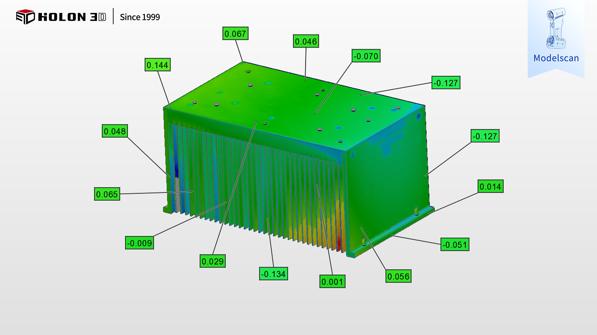 采用 HOLON 3D Model 49 手持式全蓝激光工业级三维扫描仪可针对性破解铝散热片检测的核心难题。该扫描仪具备工业计量级精度(实测 0.02mm,最高可达 0.01mm),搭配全蓝激光技术的强抗反光能力,无需对铝散热片表面进行任何预处理,即可穿透金属反光干扰,精准捕捉翅片边缘、厚度、间距及基体轮廓等关键特征数据;搭载标准模式、大范围模式、深孔模式、精细模式四种扫描模式,可根据散热片的基体整体轮廓、密集翅片区域、窄间隙细节等不同特征灵活切换 —— 精细模式适配细小翅片与窄间隙的精准扫描,大范围模式提升基体区域扫描效率,配合手持灵活操作设计,可轻松深入翅片间隙等狭小区域,不受密集结构限制,实现全特征无死角扫描;扫描仪高速扫描能力大幅缩短单件检测时间,适配批量质检需求,无接触式测量方式既避免了预处理对翅片结构的影响,又能快速获取高密度点云数据,保障检测效率与数据可靠性;其适应性极强,在车间生产线、仓储质检区等不同环境下,仅需粘贴少量标志点辅助定位,无需复杂设备搭建即可稳定输出高质量数据。扫描后的数据与原始模型比对可生成清晰的三维检测色谱图,准确量化各项误差分布,科学判断铝散热片加工生产合格性,完全契合客户严苛需求,为铝散热片的质量管控、加工工艺优化及批量生产提供可靠数字化支撑。