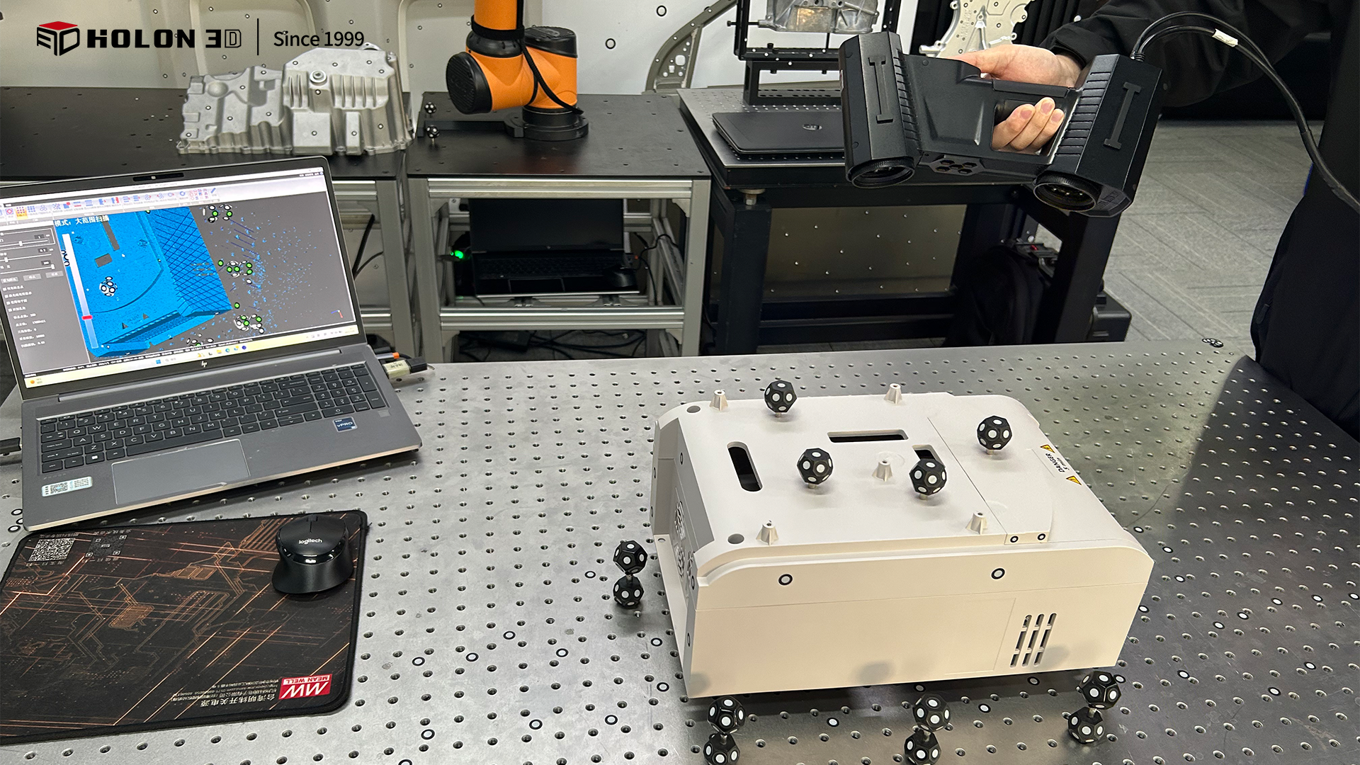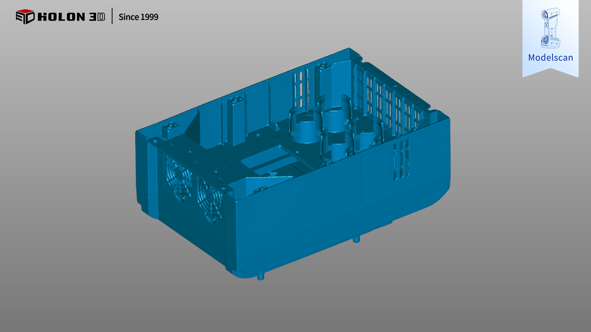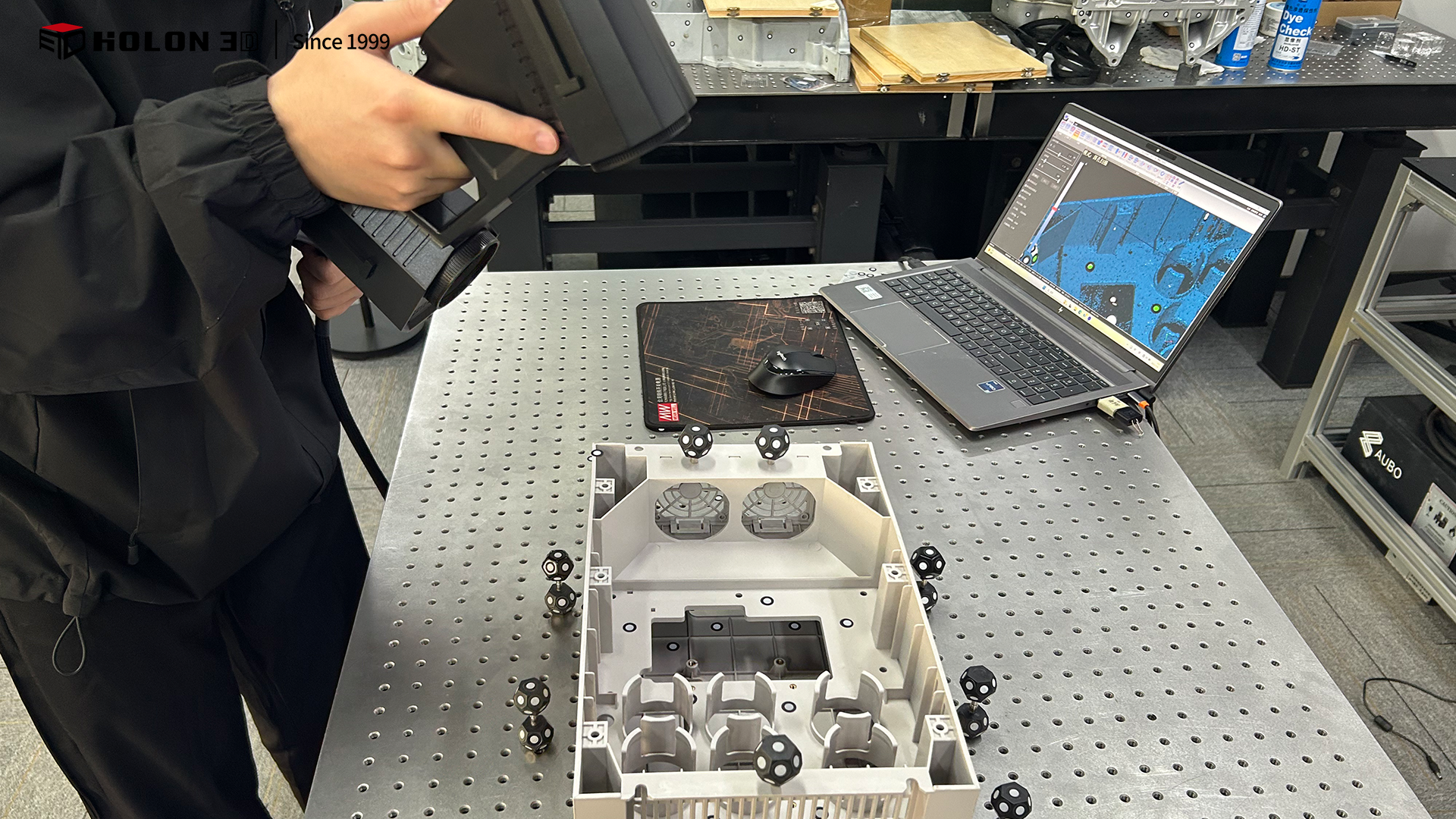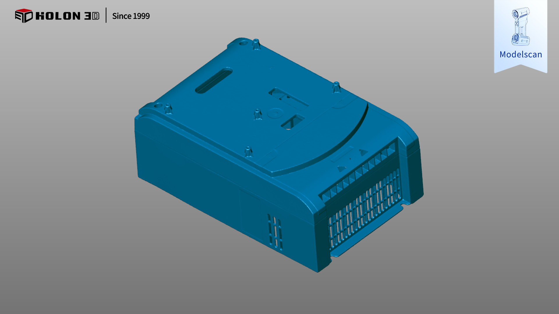 变频器外壳壳体是保障内部电气元件安全、稳定运行的核心防护部件,其外形轮廓、安装孔位精度、腔体结构完整性直接影响变频器的装配适配性与防护性能。客户需通过三维扫描获取外壳壳体高精度、高细节还原度及完整的三维数据,与原始模型比对生成三维检测色谱图,直观量化轮廓公差、孔位偏差、腔体尺寸误差等核心指标,以此科学判断加工生产是否合格。由于变频器外壳壳体多为塑胶或金属材质(表面特性各异),结构上包含复杂腔体、密集安装孔、卡扣槽等细节特征,客户对扫描精度、细节还原及数据完整性要求严苛,传统测量方式难以满足需求,因此选择 HOLON 3D Model 49 手持式全蓝激光工业级三维扫描仪,为变频器外壳壳体提供精准高效的数字化检测方案。