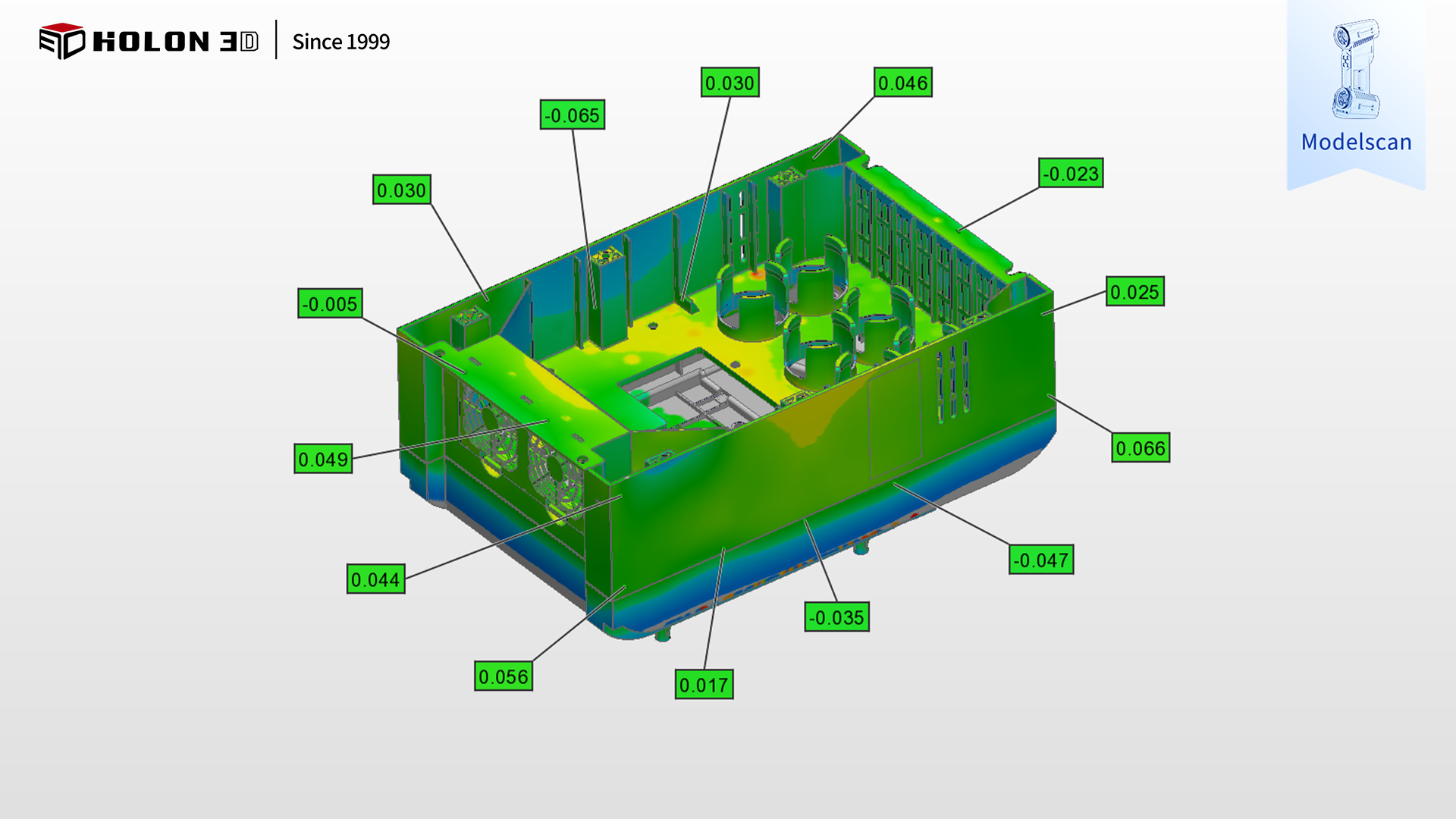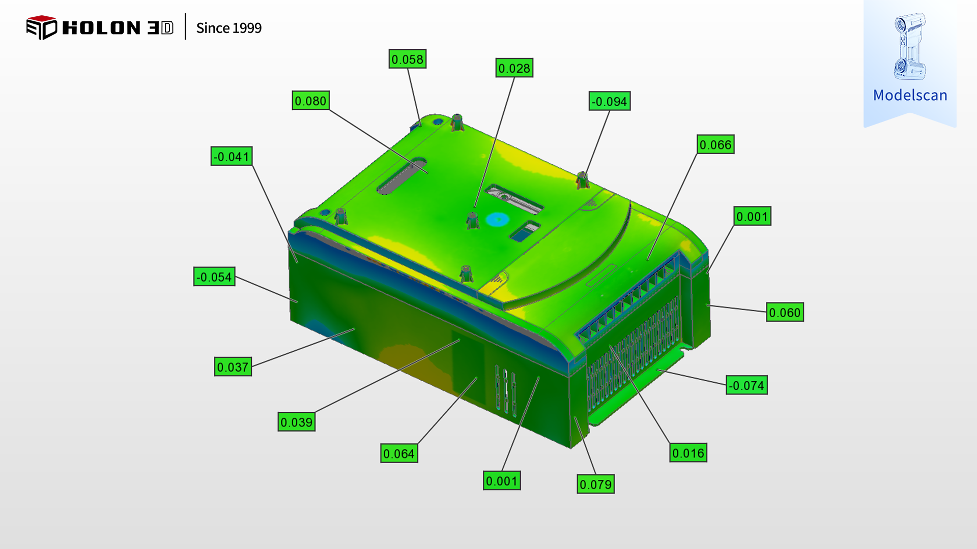 采用 HOLON 3D Model 49 手持式全蓝激光工业级三维扫描仪可针对性破解变频器外壳壳体检测的核心难题。该扫描仪具备工业计量级精度,搭配全蓝激光技术的强材质适配性,无需对壳体表面进行任何预处理,即可精准适配塑胶、金属等不同材质的表面特性,稳定采集高质量数据,避免材质干扰导致的失真问题;搭载标准模式、大范围模式、深孔模式、精细模式四种扫描模式,可根据壳体的整体外形轮廓、封闭腔体内部、密集安装孔、细小卡扣槽等不同特征灵活切换 —— 深孔模式适配安装孔与腔体内部的精准扫描,精细模式聚焦卡扣槽等细微特征的细节还原,不受复杂结构限制,实现全特征无死角扫描;扫描仪高速扫描能力大幅缩短单件检测时间,适配批量质检需求,无接触式测量方式既避免了预处理对壳体的损伤,又能快速获取高密度点云数据,保障检测效率与数据可靠性;其适应性极强,在各类检测环境下仅需粘贴少量标志点辅助定位,无需复杂设备搭建即可稳定输出高质量数据。扫描后的数据与原始模型比对可生成清晰的三维检测色谱图,准确量化各项误差分布,科学判断变频器外壳壳体加工生产合格性,完全契合客户严苛需求,为变频器外壳壳体的质量管控、加工工艺优化及批量生产提供可靠数字化支撑。