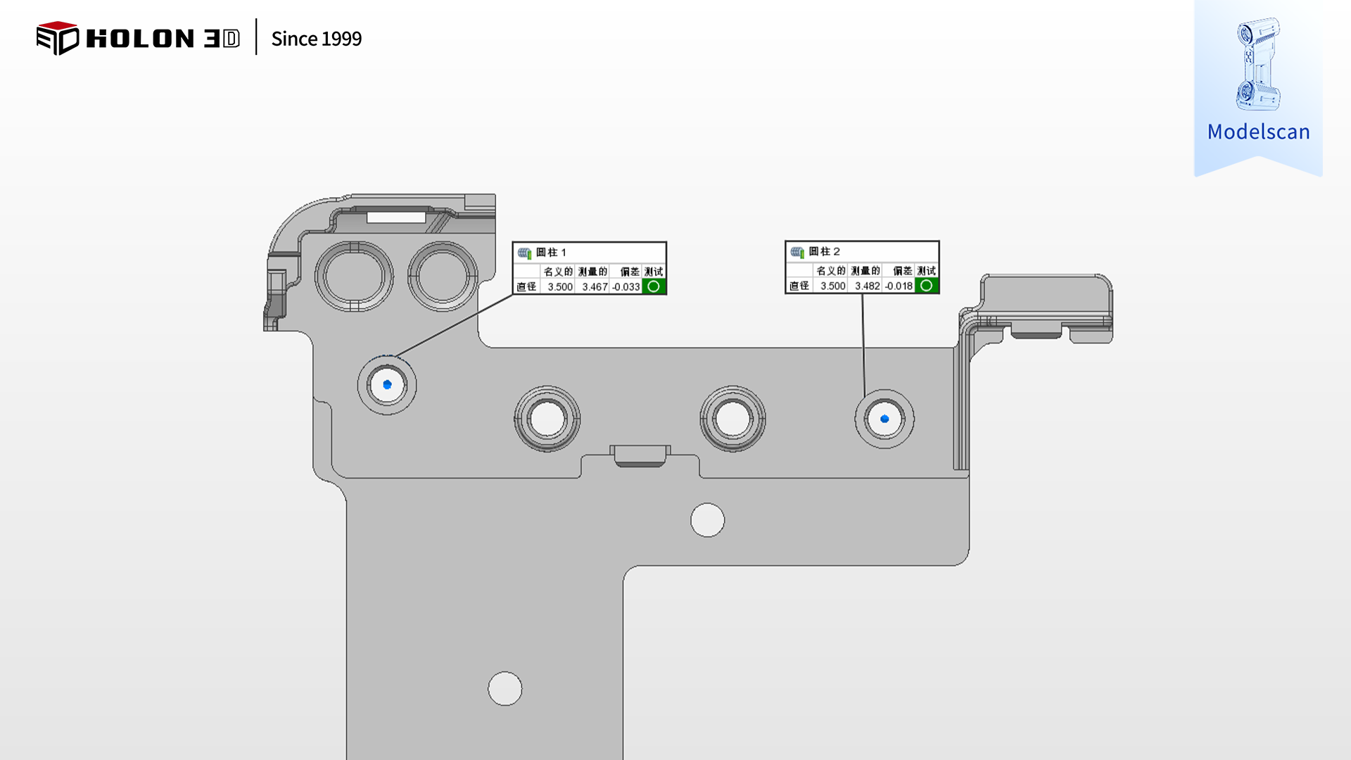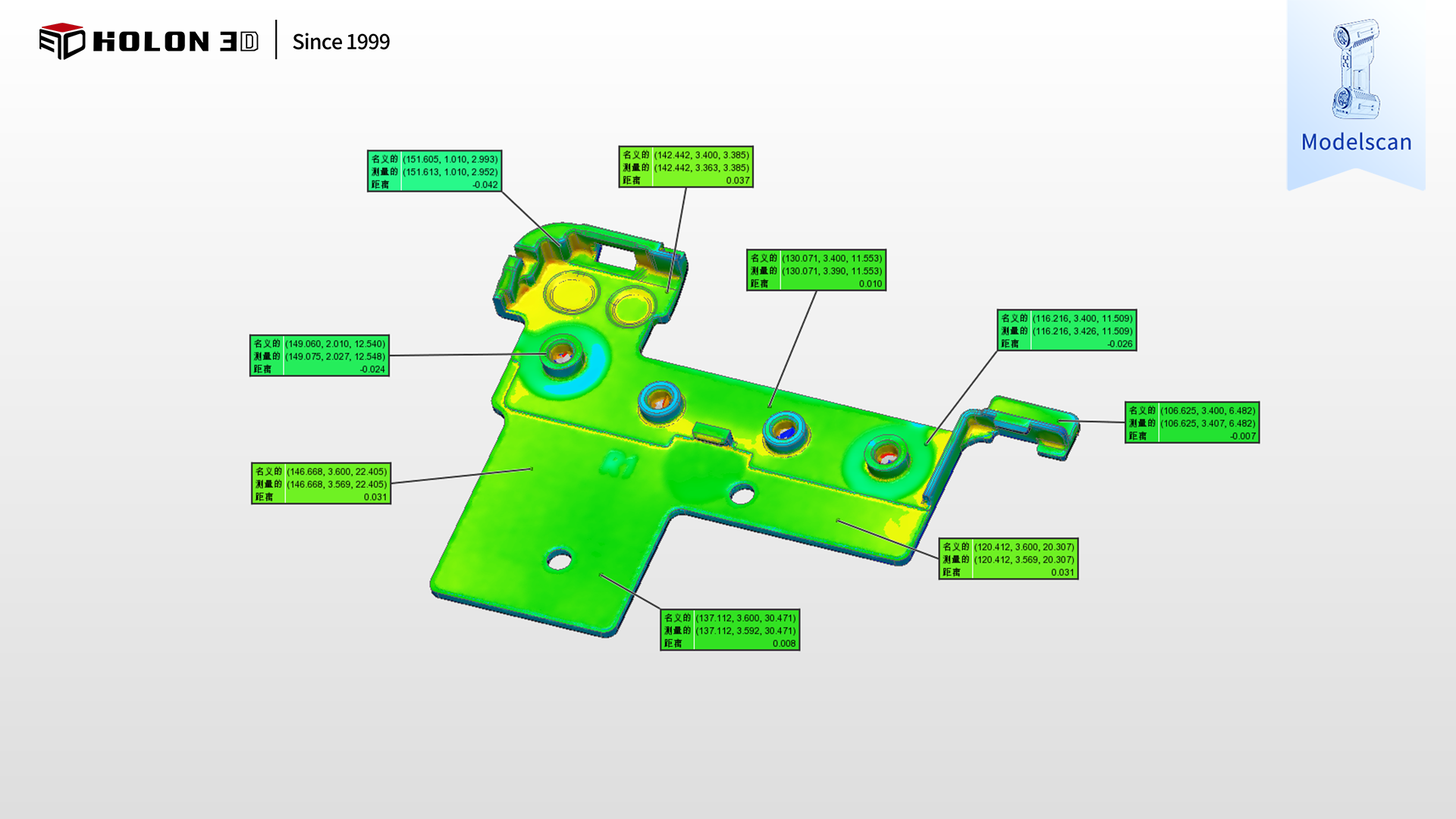 采用 HOLON 3D Model 49 手持式全蓝激光工业级三维扫描仪,可针对性破解电子设备精密金属零部件检测的核心难题。该扫描仪具备工业计量级精度,实测精度达 0.02mm,最高可达 0.01mm,搭配全蓝激光技术,不惧不同工件的不同表面材质特性,无论是反光还是哑光金属表面,都能稳定采集数据,避免材质带来的干扰;更搭载四种扫描模式,可根据零部件的细微卡槽、微小孔径等不同特征细节灵活切换,精准捕捉每一处关键细节,确保细节还原度与数据完整性,为生成精准三维检测色谱图奠定坚实基础;手持设计灵活便捷,不受零部件小巧体型与复杂结构限制,可轻松调整扫描角度,无测量盲区,全面覆盖零部件所有区域;高速扫描能力大幅缩短单件检测时间,配合无接触式测量方式,既避免了表面刮伤与受力变形的风险,又能快速获取可靠数据,高效支撑合格性判定;扫描仪适应性强,不受场景约束,在实验室、车间等不同环境下,仅需粘贴少量标志点辅助定位,无需额外复杂前期准备,即可稳定输出高质量数据。扫描后生成的三维数据精准、完整且细节还原度高,与原始模型比对可清晰生成三维检测色谱图,能准确量化关键尺寸公差、细微结构偏差等指标的误差,科学判断零部件合格性,完全符合客户的严苛需求,为电子设备精密金属零部件的质量管控、工艺优化及批量生产提供了可靠的数字化保障。