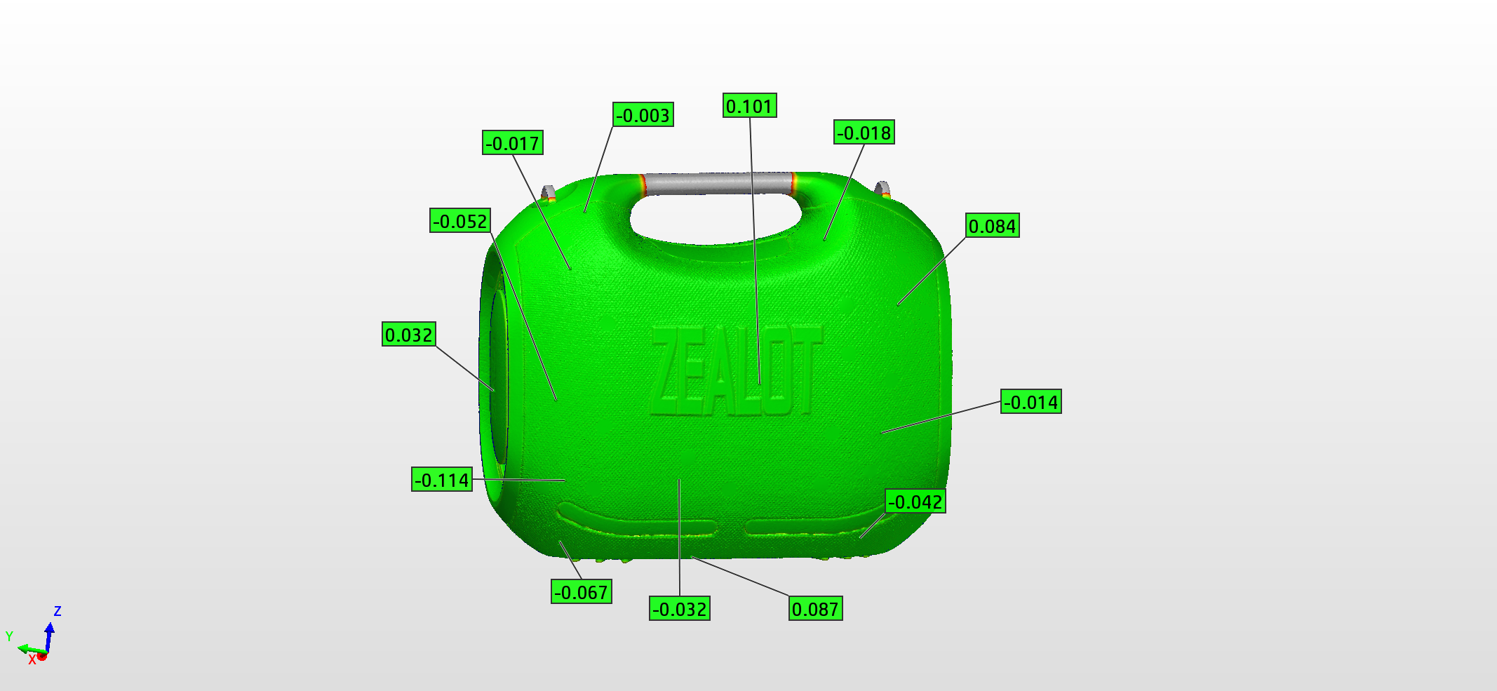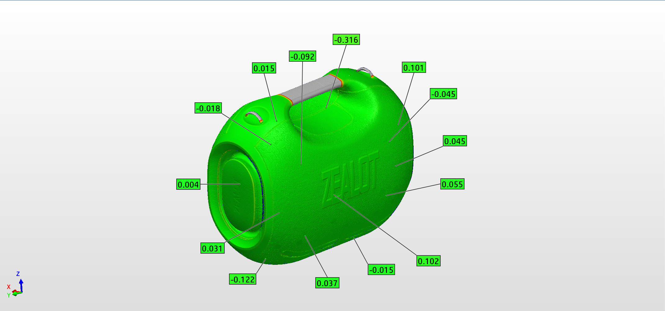 采用 HOLON3D手持式全蓝激光工业级三维扫描仪,操作灵活、便携,以420万点/秒的速度高效获取外壳外曲面、内部卡扣、螺丝柱、密封槽等所有细微特征。将扫描数据与原始模型对比,一键生成全局偏差色谱图(红/蓝/绿直观显示偏差分布),量化整体变形量、装配面轮廓度、卡扣位置度及密封槽尺寸。非常适用于模具试模、产线抽检、来料检测等场景。