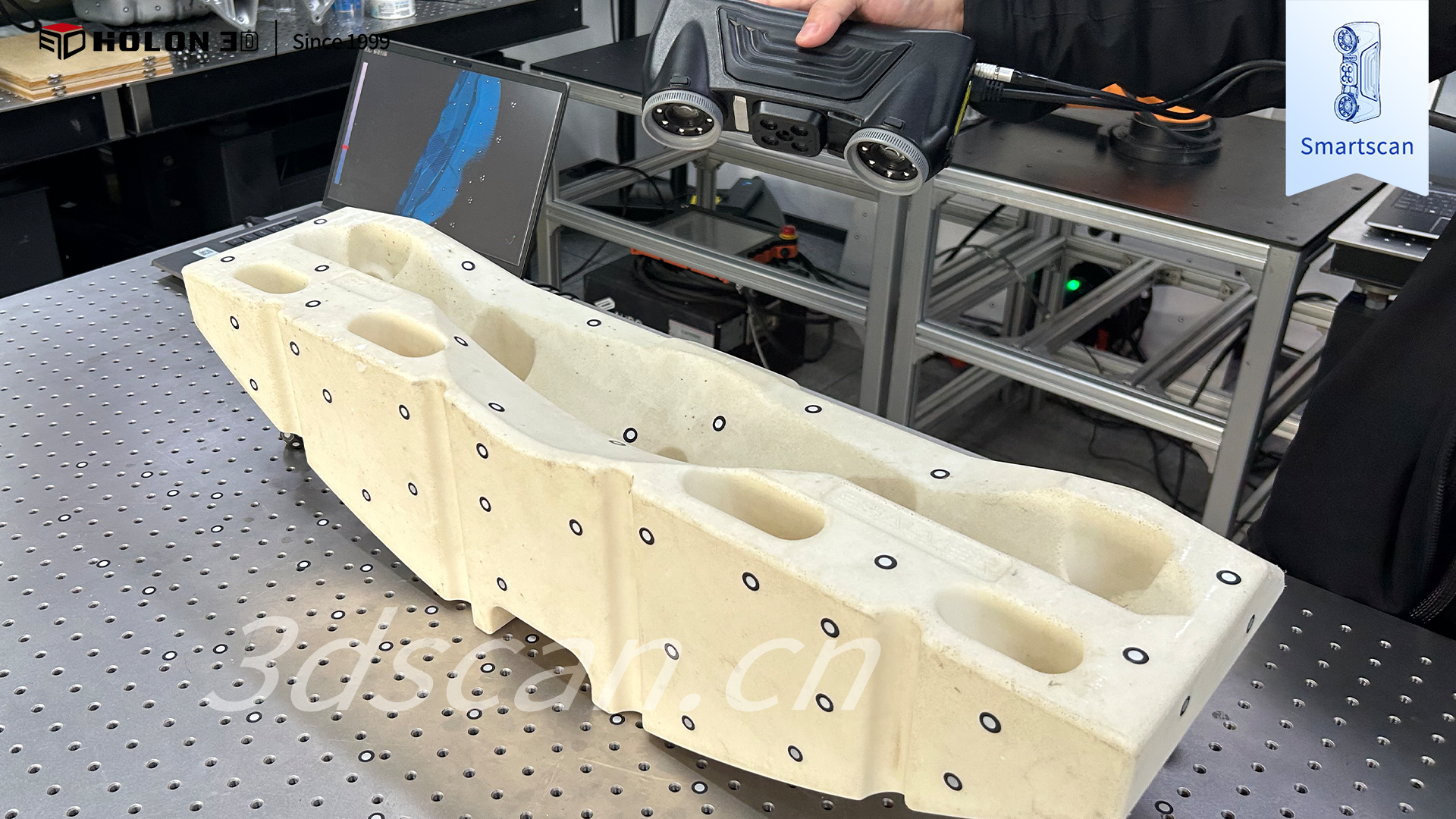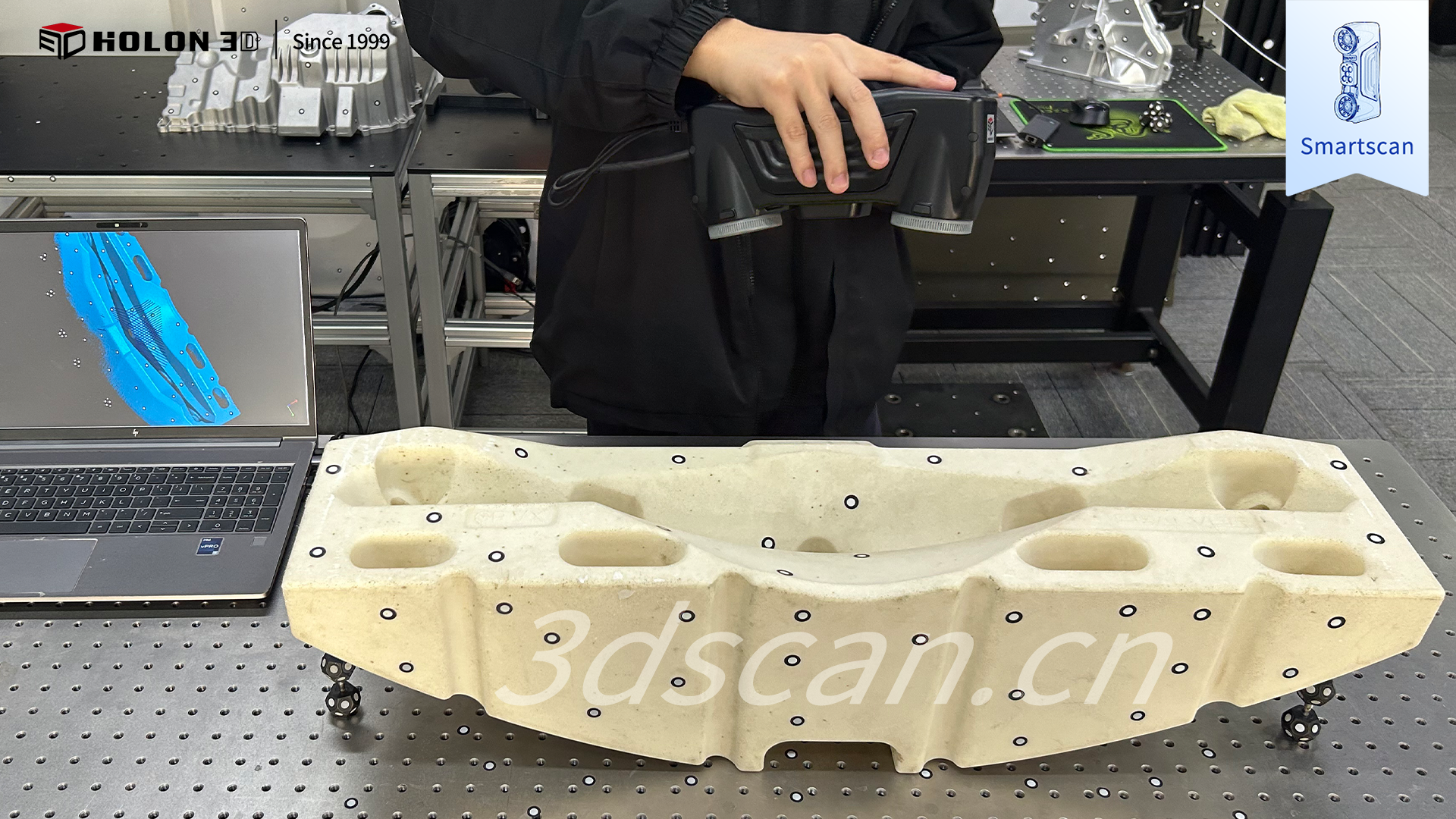 采用 HOLON3D Smart 49 扫描仪可针对性破解这一难题,其具备工业计量级精度,搭配全蓝激光技术,无需特殊预处理即可适配支架材质特性,精准捕捉整体轮廓与细微特征。设备搭载四种扫描模式,可根据支架不同特征区域灵活切换,配合手持设计自由调整扫描角度,轻松深入隐蔽衔接部位,实现全特征无死角扫描。高速无接触式测量避免对工件造成损伤,且不受场景约束,仅需粘贴少量标志点即可稳定输出高密度点云数据。扫描数据可直接导入逆向建模软件生成合格的生产用 CAD 模型,同时为产品结构优化提供精准数据支撑,完全契合客户需求,为船首摩托艇止推支架的复刻生产与性能升级提供可靠数字化保障。