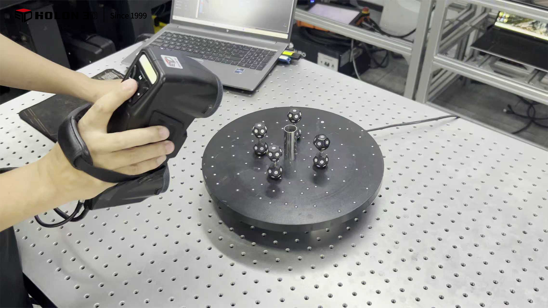 激光切割不锈钢空心管作为工业装配中的关键结构件,其整体质量与孔位精度直接影响后续装配的适配性。客户需对该激光切割管进行三维扫描,获取精准三维数据以开展质量检测,核心验证管体整体形态是否合格、激光切割孔位的位置偏差是否在公差范围内。由于工件为不锈钢材质且表面反光强烈,同时分布着大量激光切割孔,客户对扫描精度与工件数据完整性要求极高,传统测量方式难以满足需求,因此选择 HOLON 3D Smart 49 手持式全蓝激光工业级三维扫描仪,为激光切割管的质量检测提供可靠数字化支撑。