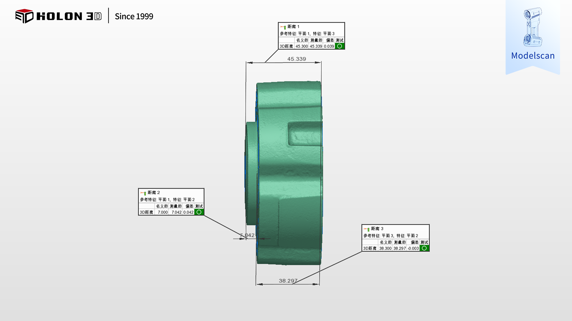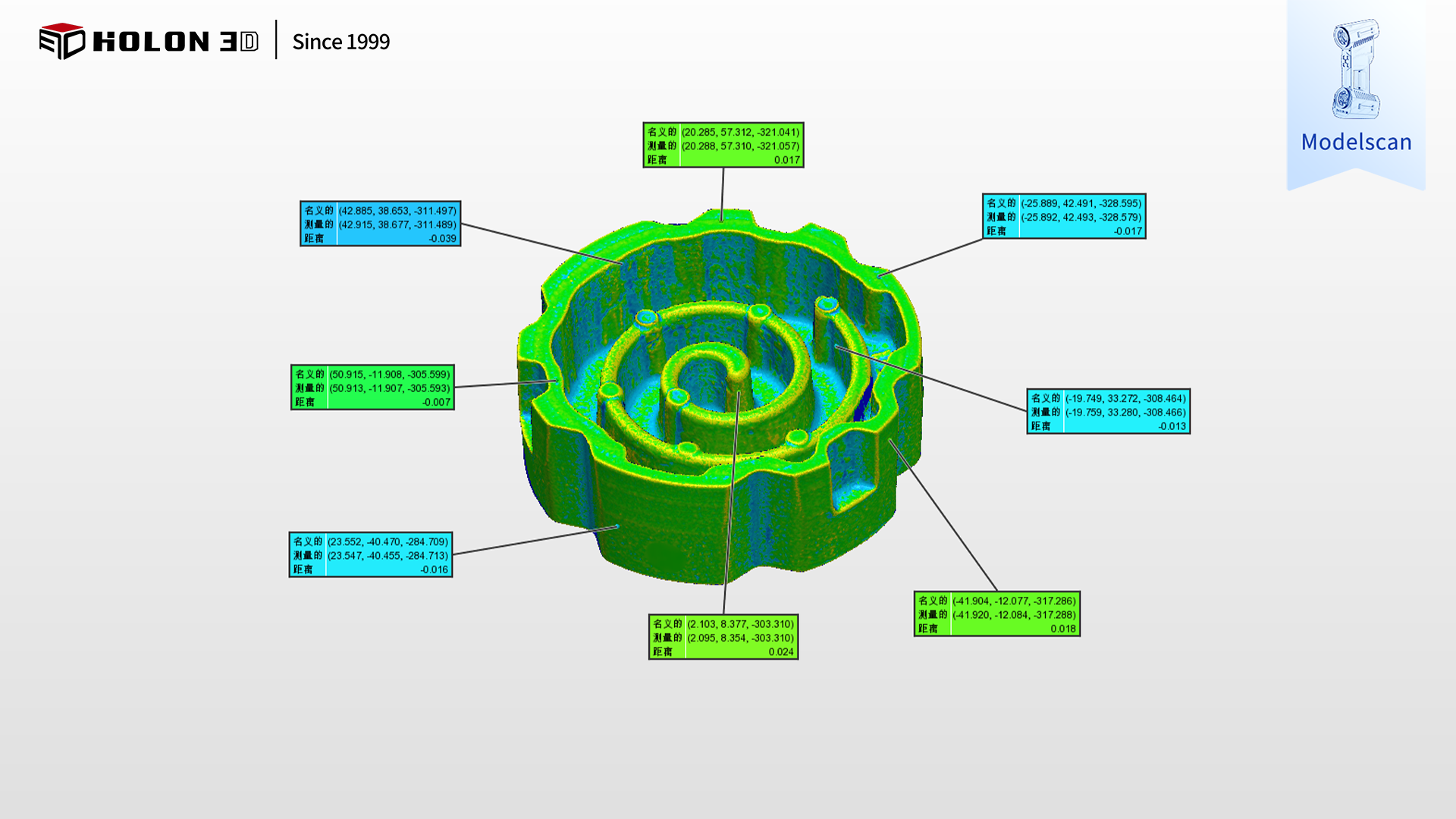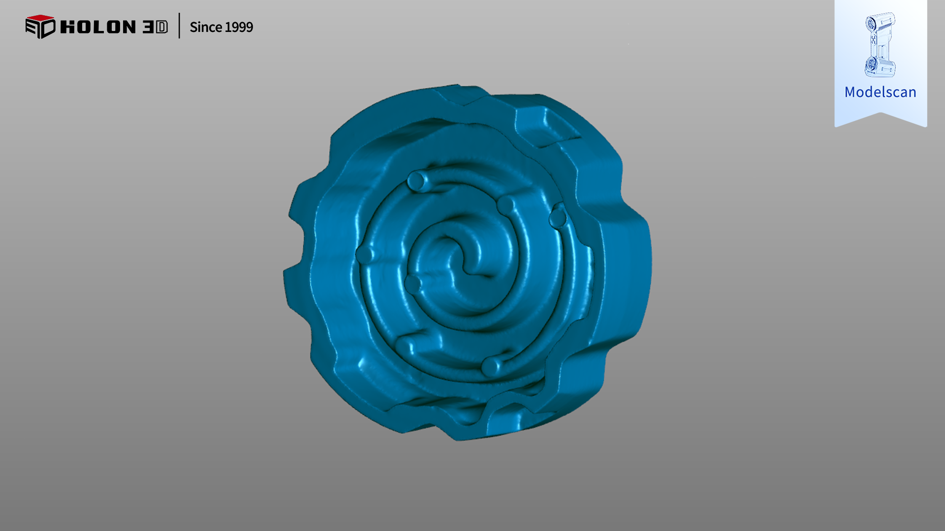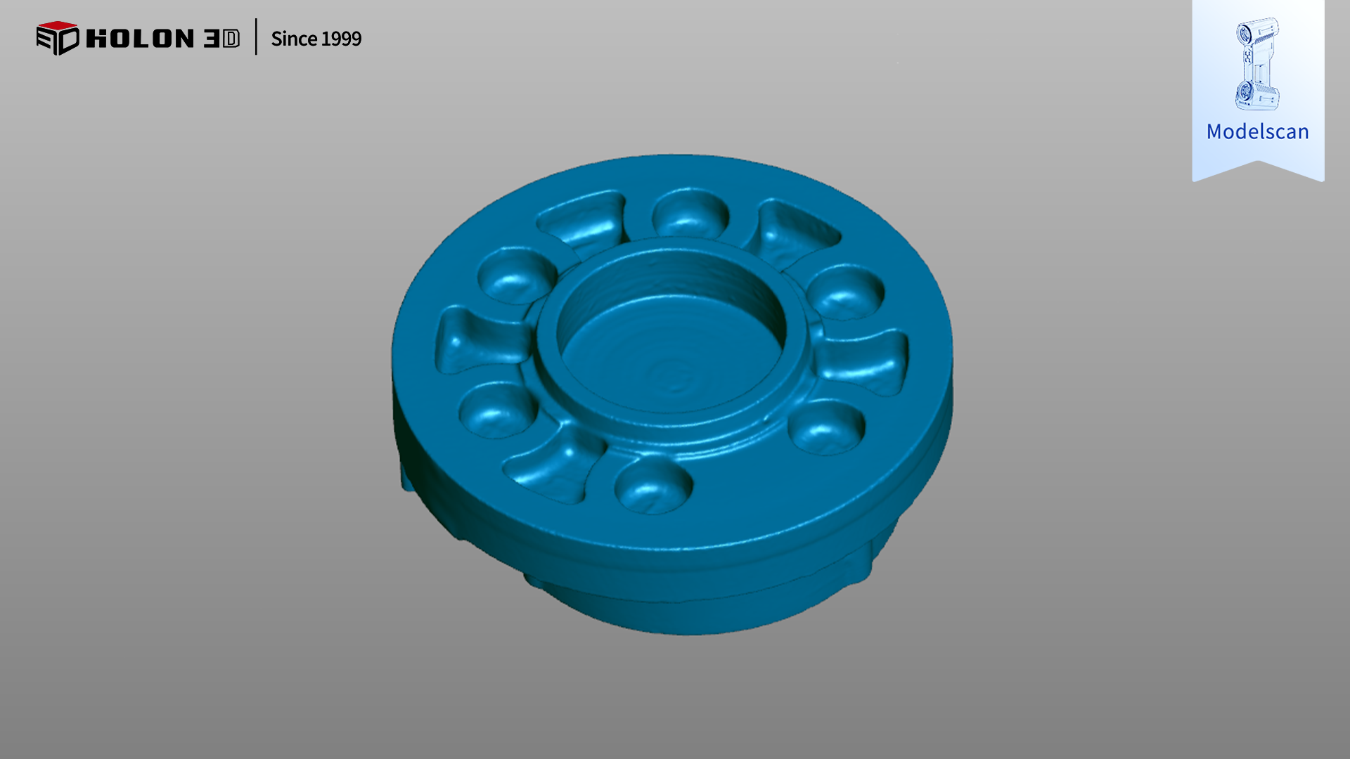 采用 HOLON 3D Model 49 手持式全蓝激光工业级三维扫描仪,可针对性破解动、静盘毛胚浇铸件检测的核心难题。该扫描仪具备工业计量级精度,实测精度达 0.02mm,最高可达 0.01mm,搭配全蓝激光技术,不惧不同毛胚浇铸件的不同表面材质特性,无论是浇铸后的哑光粗糙面还是局部反光区域,都能稳定穿透表面干扰,精准采集数据;更搭载四种专属扫描模式,可根据铸件的型面过渡区域、微小预留结构、边缘轮廓等不同特征细节灵活切换,高效捕捉每一处关键结构与浇铸固有细微特征,确保细节还原度与数据完整性,为生成精准三维检测色谱图奠定坚实基础;手持设计灵活便捷,不受毛胚浇铸件体型与复杂型面限制,可自由调整扫描角度,轻松覆盖铸件的正反两面、边缘及隐蔽部位,无测量盲区;高速扫描能力大幅缩短单件检测时间,配合无接触式测量方式,既避免了测量工具磨损与铸件表面损伤的风险,又能快速获取全表面可靠数据,高效支撑合格性判定;扫描仪适应性强,不受场景约束,在车间、仓储等不同环境下,仅需粘贴少量标志点辅助定位,无需额外复杂前期准备(如表面打磨、喷粉),即可稳定输出高质量数据。扫描后生成的三维数据精准、完整且细节还原度高,与原始模型比对可清晰生成三维检测色谱图,能准确量化型面偏差、壁厚均匀性等关键指标的误差,科学判断毛胚浇铸件合格性,完全符合客户的严苛需求,为动、静盘毛胚浇铸件的质量管控、浇铸工艺优化及批量生产提供了可靠的数字化保障。