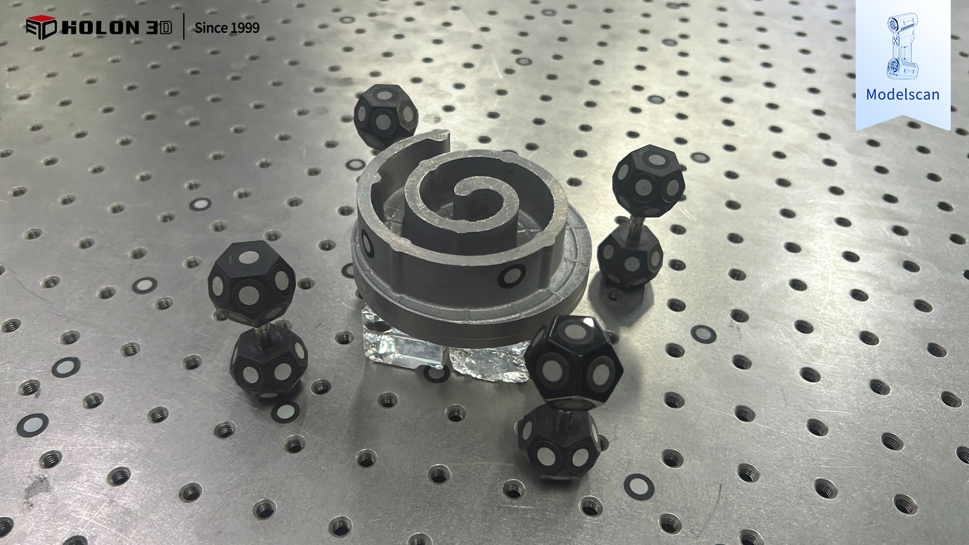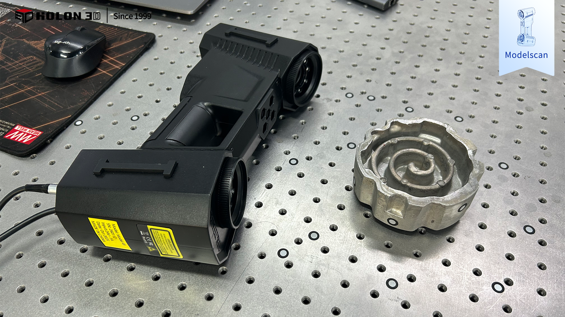 动、静盘毛胚浇铸件是各类机械产品的基础结构部件,客户需对这类毛胚浇铸件进行三维扫描,获取高精度、细节还原度高且完整的三维数据,通过与原始模型比对生成三维检测色谱图,直观量化型面偏差、壁厚均匀性、关键基准位误差等核心指标的分布情况,以此科学判断铸件是否合格。由于动、静盘毛胚浇铸件为浇铸原始状态,表面材质特性复杂,且包含型面过渡、预留装配结构等关键细节,客户对扫描精度、细节还原度及数据完整性要求极高,同时需适配车间抽检、批量质检等多样化场景,传统测量方式难以满足需求,因此选择 HOLON 3D Model 49 手持式全蓝激光工业级三维扫描仪,为动、静盘毛胚浇铸件的精准质量检测提供高效可靠的数字化支撑。