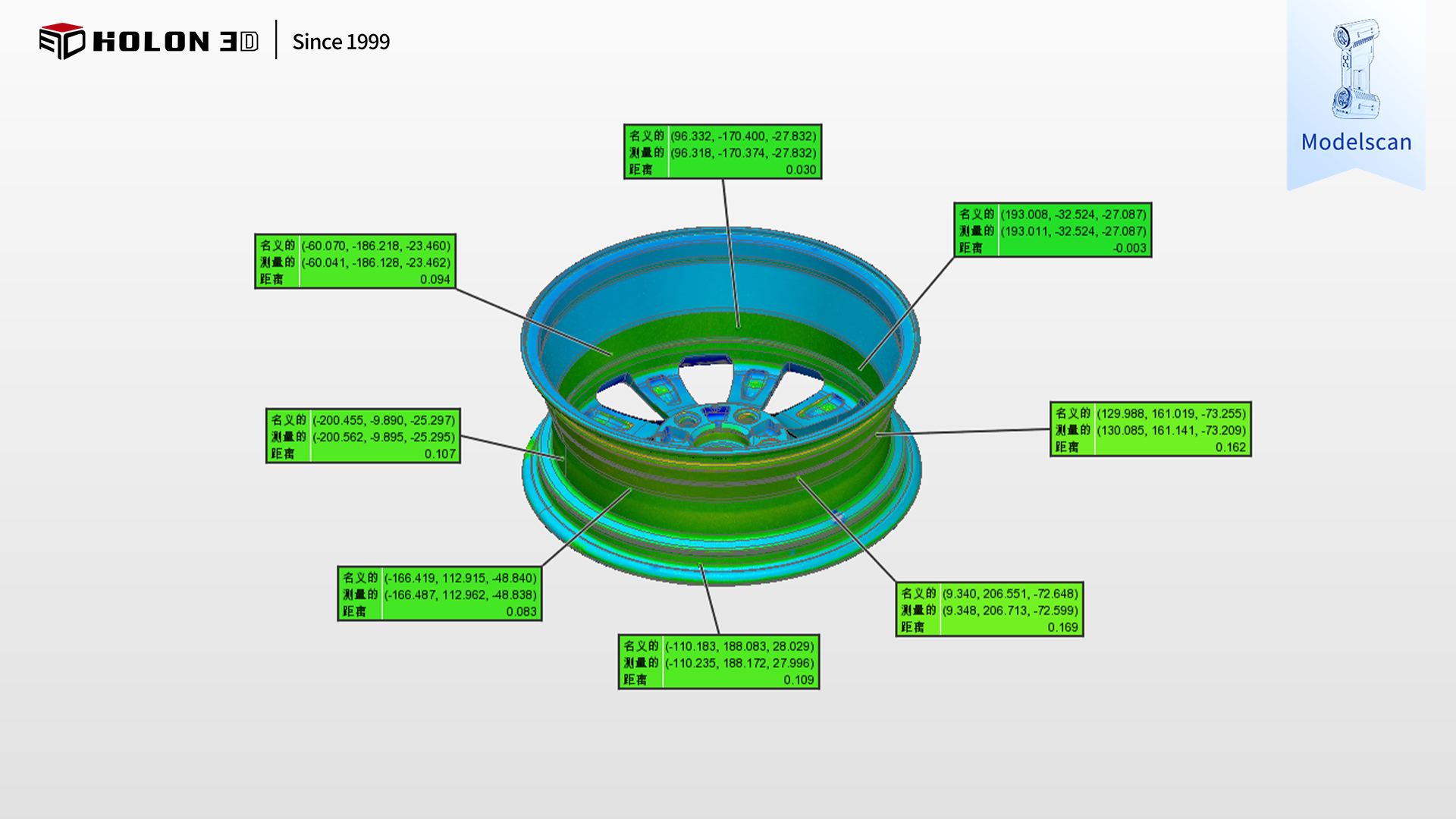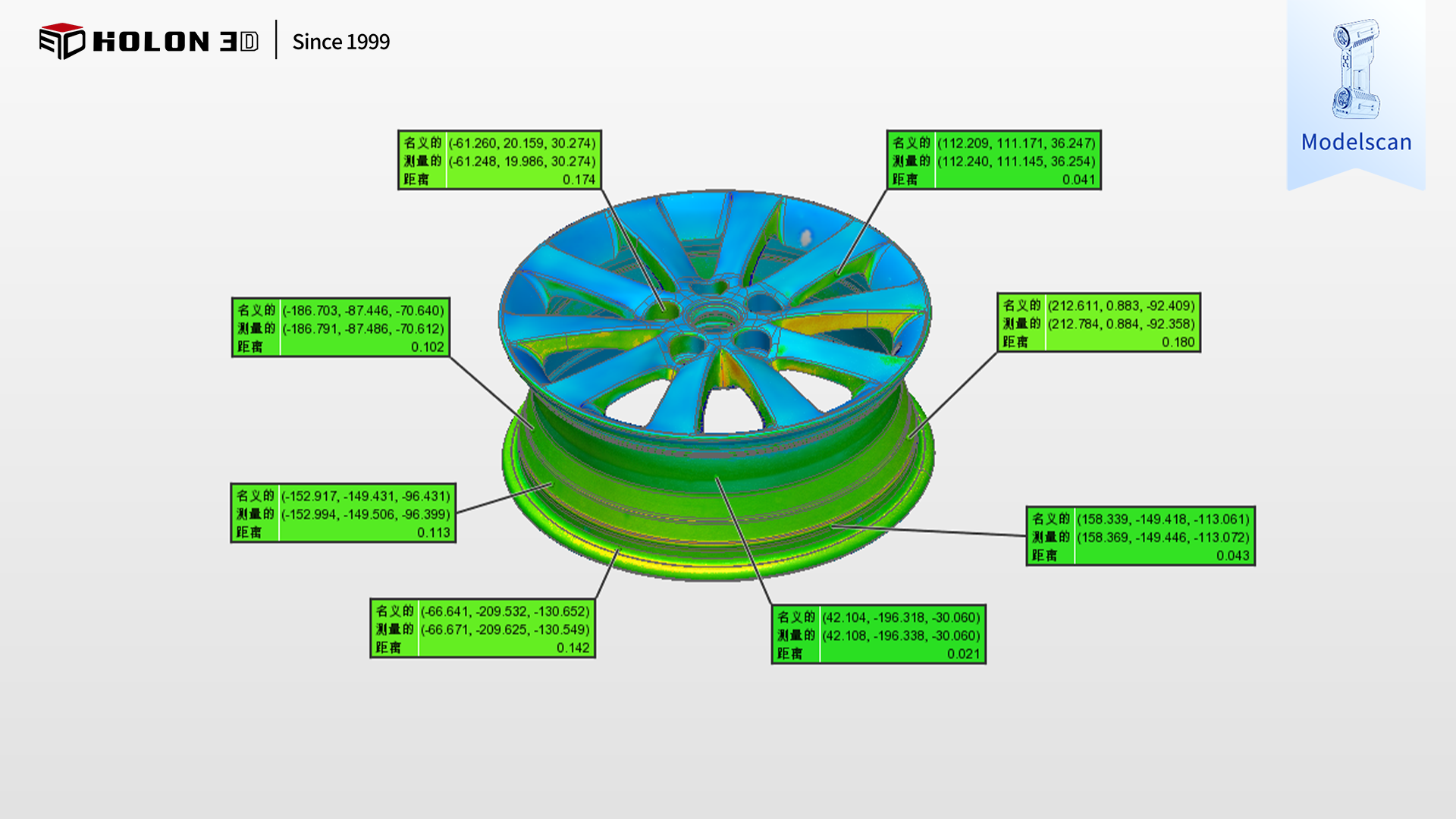 采用 HOLON3D Model 49 手持式全蓝激光工业级三维扫描仪,可针对性破解汽车轮毂检测的核心难题。该扫描仪具备工业计量级精度,实测精度达 0.02mm,最高可达 0.01mm,凭借全蓝激光技术的高穿透性与识别力,无需依赖反光辅助,即可精准捕捉轮毂的轮辋直径、辐条厚度、安装孔位尺寸、曲面弧度及边缘轮廓等关键细节,甚至可识别微米级误差,获取全表面高精度三维数据,为生成精准三维检测色谱图奠定坚实基础,确保误差量化无偏差;手持设计灵活便捷,不受轮毂环形结构与隐蔽区域限制,可自由围绕轮毂调整扫描角度,轻松深入轮辋内壁、辐条间隙等不易触及的部位,保障数据完整性,让色谱图全面呈现整体误差分布;高速扫描能力大幅缩短复杂轮毂的数据采集时间,配合无接触式测量方式,既避免了刮伤表面工艺与受力变形的风险,又能快速获取可靠数据,高效支撑合格性判定;扫描仪适应性强,不受场景约束,在车间生产线、仓储质检区等复杂环境下无需复杂前期准备(如表面喷粉、贴标记点),即可稳定输出高质量数据。扫描后生成的三维数据精准、完整,与原始模型比对可清晰生成三维检测色谱图,能准确量化轮辋圆度、辐条对称度等关键指标的误差,科学判断轮毂合格性,完全符合客户对高精度与完整性的严苛需求,为汽车轮毂的质量管控、工艺优化及批量生产提供了可靠的数字化保障。