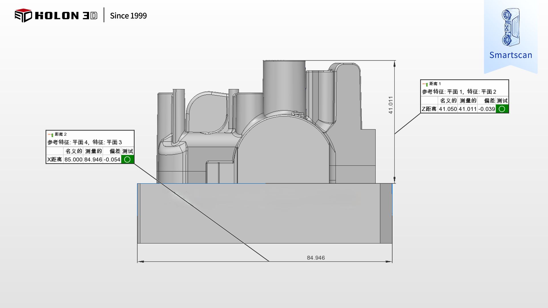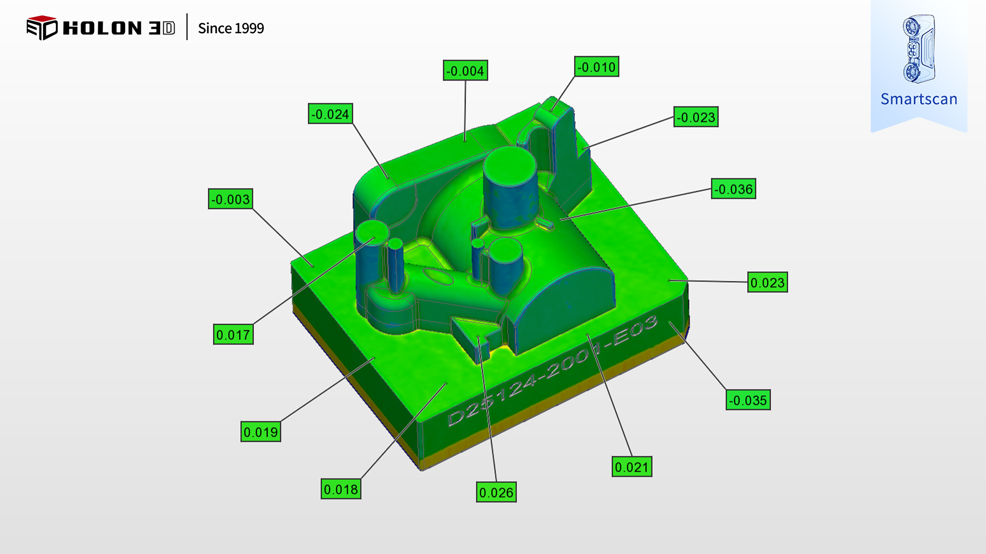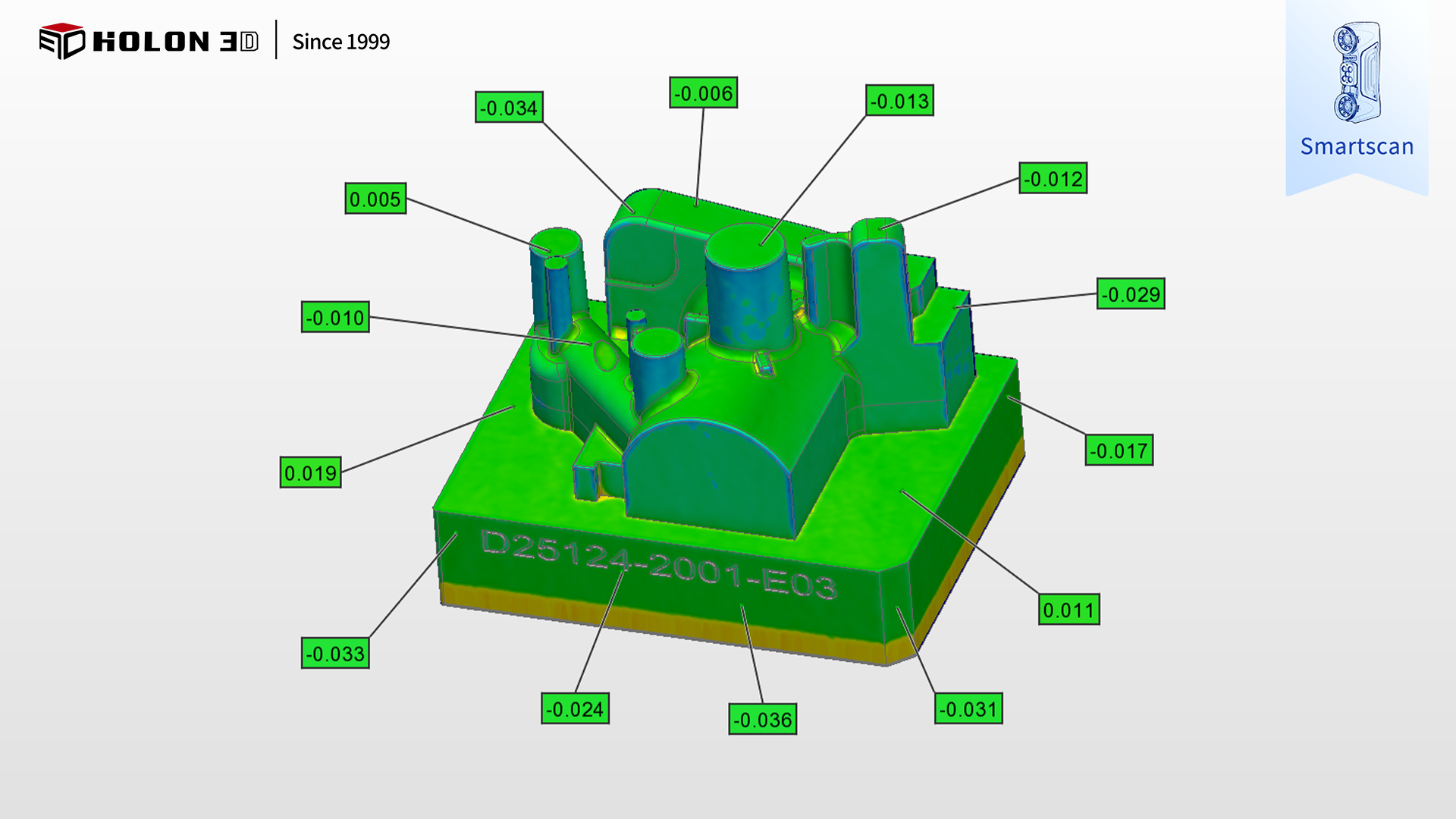 采用 HOLON3D Smart 49 扫描仪可针对性破解难题,其具备工业计量级精度,搭配全蓝激光技术,无需特殊预处理即可适配石墨吸光材质,精准捕捉胚体轮廓、型腔细节等关键数据;搭载四种扫描模式,可根据胚体整体轮廓、型腔内部等不同特征灵活切换,配合手持设计自由调整角度,实现全区域无死角扫描;高速无接触测量避免石墨材质破损,不受场景约束,仅需粘贴少量标志点即可稳定输出高质量数据,扫描数据与原始模型比对生成清晰色谱图,准确量化误差,科学判定合格性,完全契合客户需求,为胚体质量管控与后续加工优化提供可靠支撑。