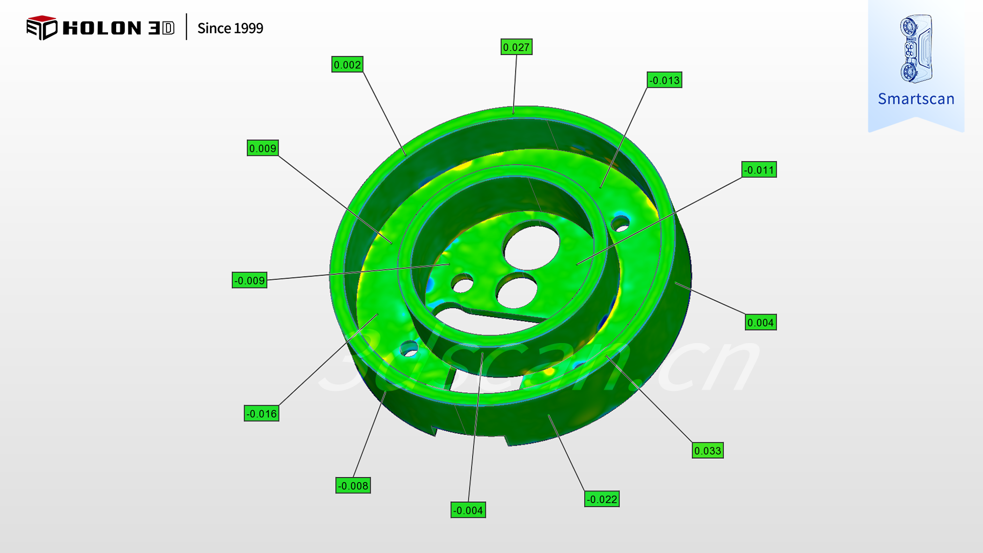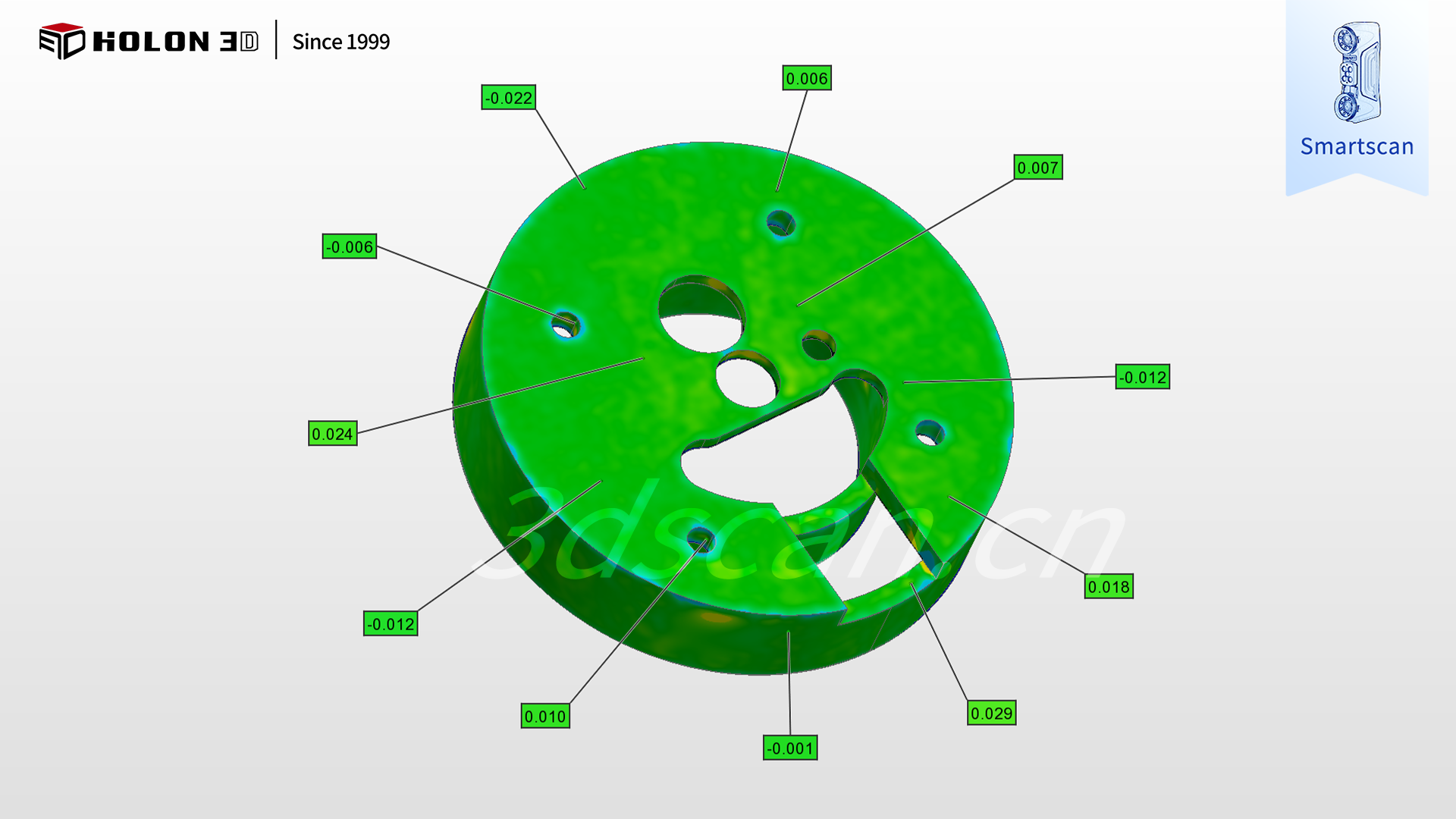 采用 HOLON3D Smart 49 扫描仪可针对性破解难题,其具备工业计量级精度,搭配全蓝激光技术,无需任何表面预处理即可穿透强反光干扰,精准捕捉抛光件轮廓、边缘及表面细节数据;搭载四种扫描模式,可根据抛光件整体轮廓、细微特征等灵活切换,配合手持设计自由调整扫描角度,实现全区域无死角扫描;高速无接触测量既避免了对抛光表面的损伤,又大幅提升检测效率,且不受场景约束,仅需粘贴少量标志点即可稳定输出高质量数据;扫描数据与原始模型比对可生成清晰三维检测色谱图,准确量化误差分布,科学判定合格性,完全契合客户严苛需求,为金属抛光件质量管控与工艺优化提供可靠支撑。