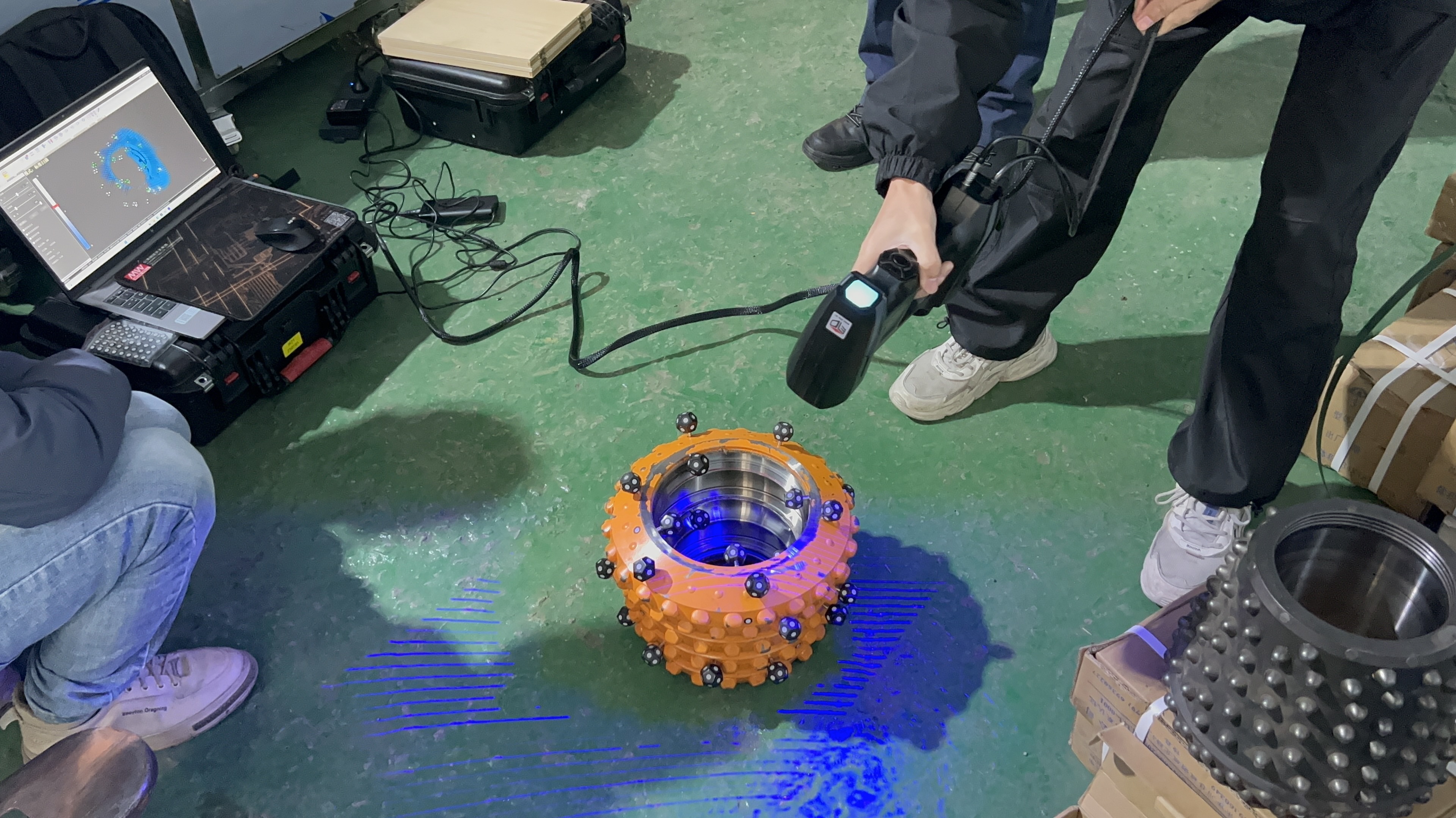 钻机滚刀是钻井作业中的关键部,。其主要作用是破碎岩石,通过压入、剪切、碾碎和拉裂等综合作用实现高效钻井。华朗工程师使用手持式三维扫描仪对其内部进行尺寸检测,以保证其公差在合格范围内。