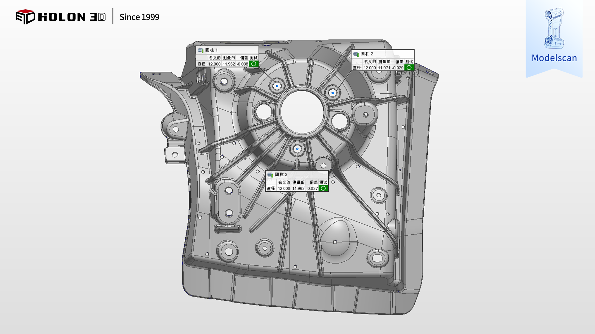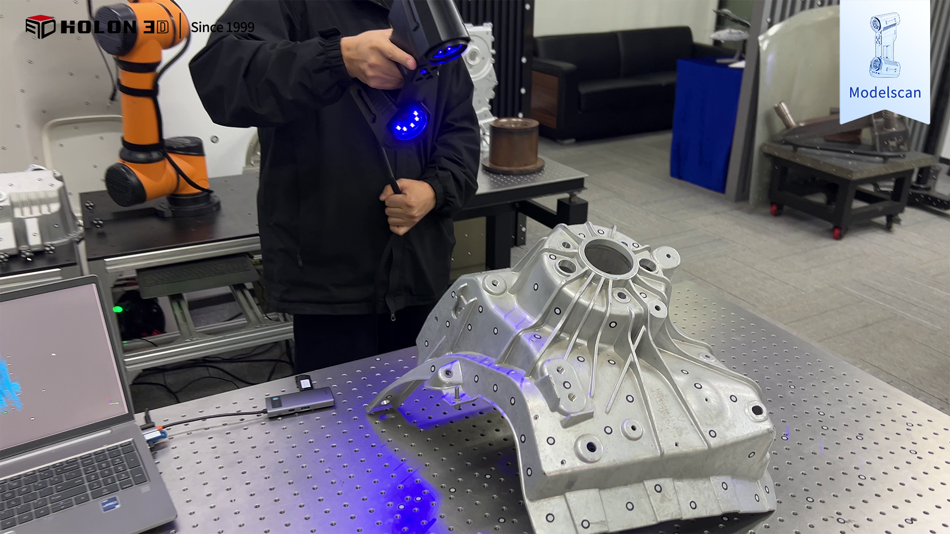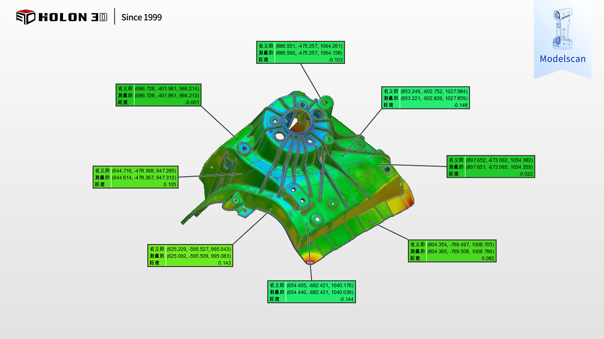 采用 HOLON3D Model 49 手持式全蓝激光工业级三维扫描仪,可针对性破解汽车下叶板内减震包检测的核心难题。该扫描仪具备工业计量级精度,实测精度达 0.02mm,最高可达 0.01mm,搭配全蓝激光技术,精准捕捉减震包的曲面弧度、安装孔位尺寸、卡扣槽深度及焊缝边缘等关键细节,甚至可识别微米级误差,获取全表面高精度三维数据,为生成精准三维检测色谱图奠定坚实基础,确保误差量化无偏差;手持设计灵活便捷,不受减震包不规则结构与隐蔽区域限制,可自由调整扫描角度,轻松深入内部凹陷部位,保障数据完整性,让色谱图全面呈现整体误差分布;高速扫描能力大幅缩短复杂曲面部件的数据采集时间,配合无接触式测量方式,既避免了受力导致的变形与表面刮伤,又能快速获取可靠数据,高效支撑合格性判定;扫描仪适应性强,不受场景约束,在车间、仓储等复杂环境下无需复杂前期准备,即可稳定输出高质量数据。扫描后生成的三维数据精准、完整,与原始模型比对可清晰生成三维检测色谱图,能准确量化误差以判断减震包合格性,完全符合客户对高精度与完整性的严苛需求,为汽车下叶板内减震包的质量管控与生产工艺优化提供了可靠的数字化保障。