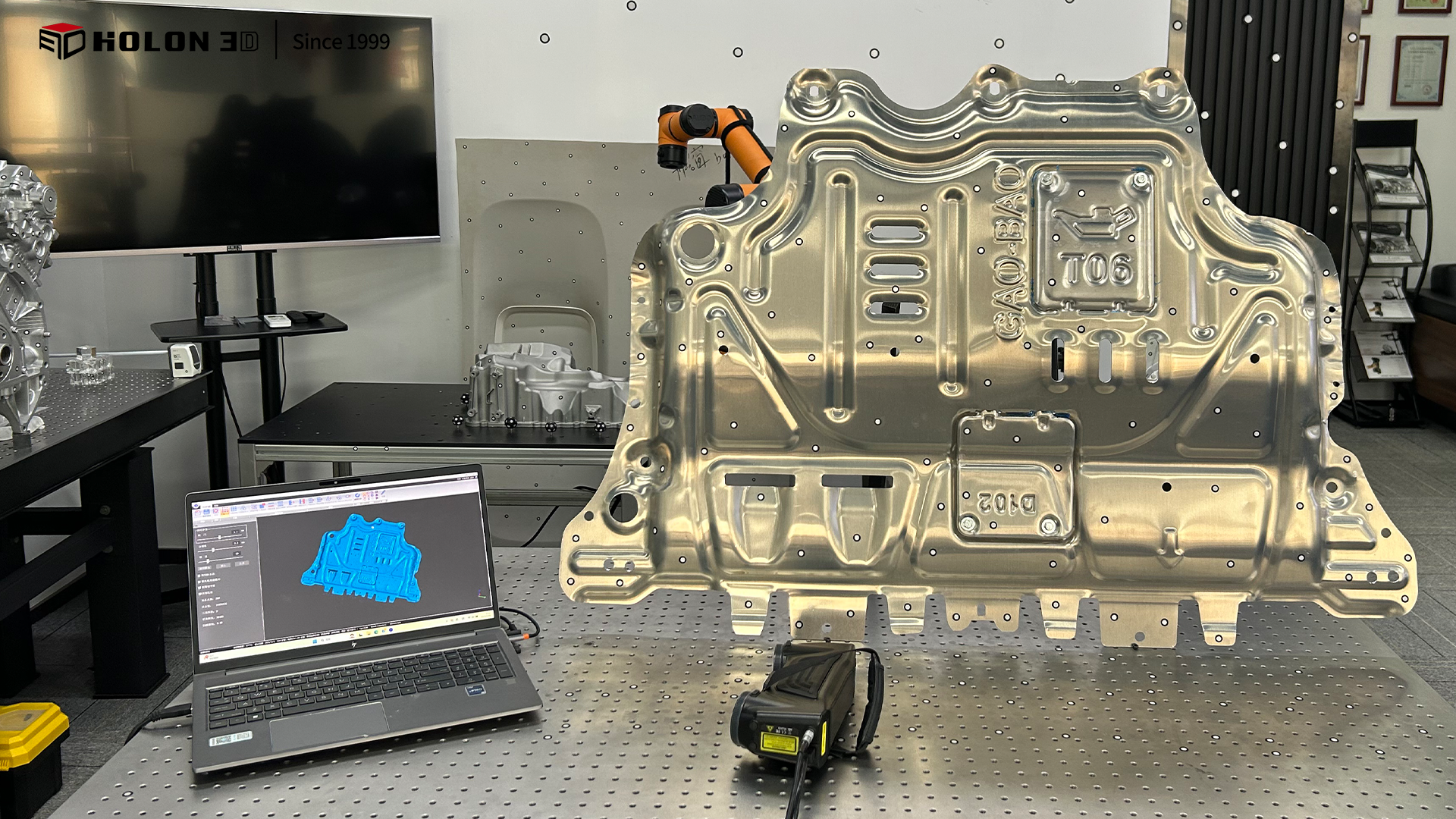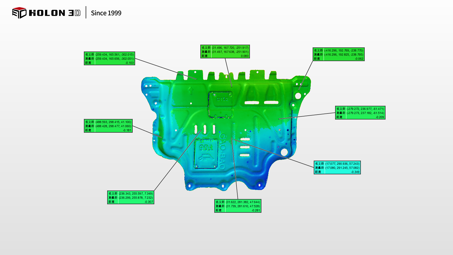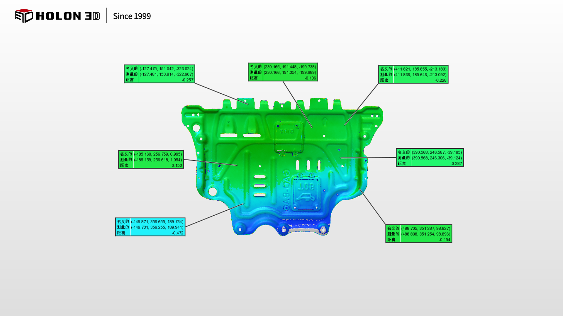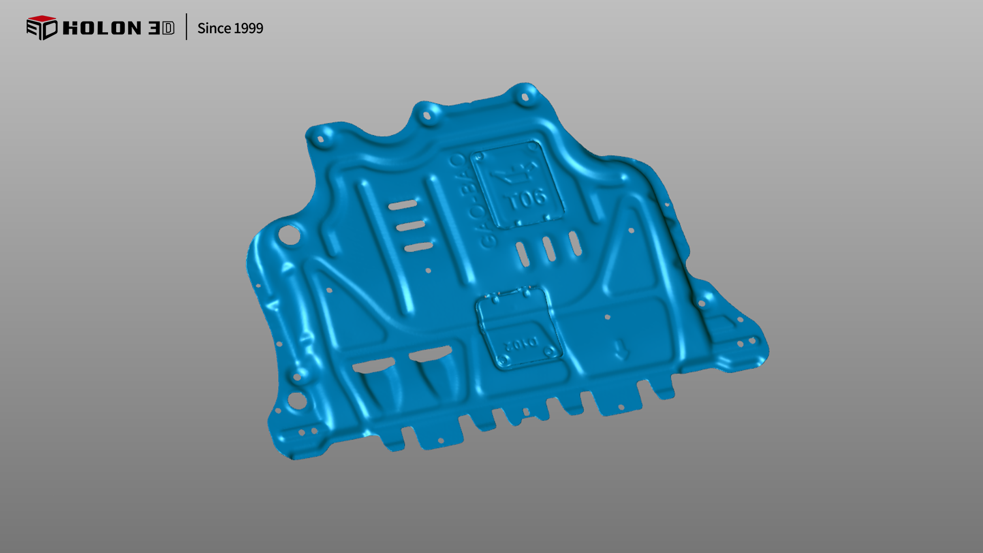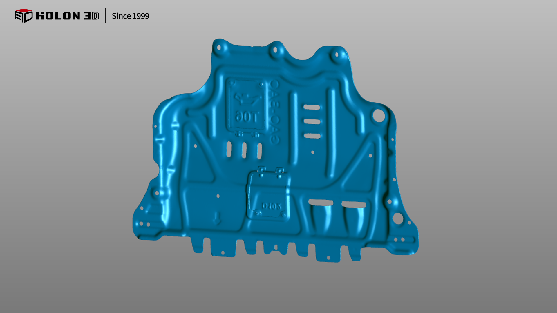 汽车发动机下护板作为保障发动机安全的关键防护部件,其尺寸精度与结构完整性直接影响装配贴合度和防护性能。客户需对该下护板进行三维扫描,获取高精度、完整的三维数据,通过与原始模型比对生成三维检测色谱图,借助色谱图直观量化误差分布,以此科学判断下护板是否合格。由于下护板表面易产生反光,且客户对扫描精度、数据完整性要求极高,同时需要适配不同检测场景,传统测量方式难以满足需求,因此选择 HOLON 3D Smart 49 手持式全蓝激光工业级三维扫描仪,为发动机下护板的精准质量检测提供高效可靠的数字化支撑。