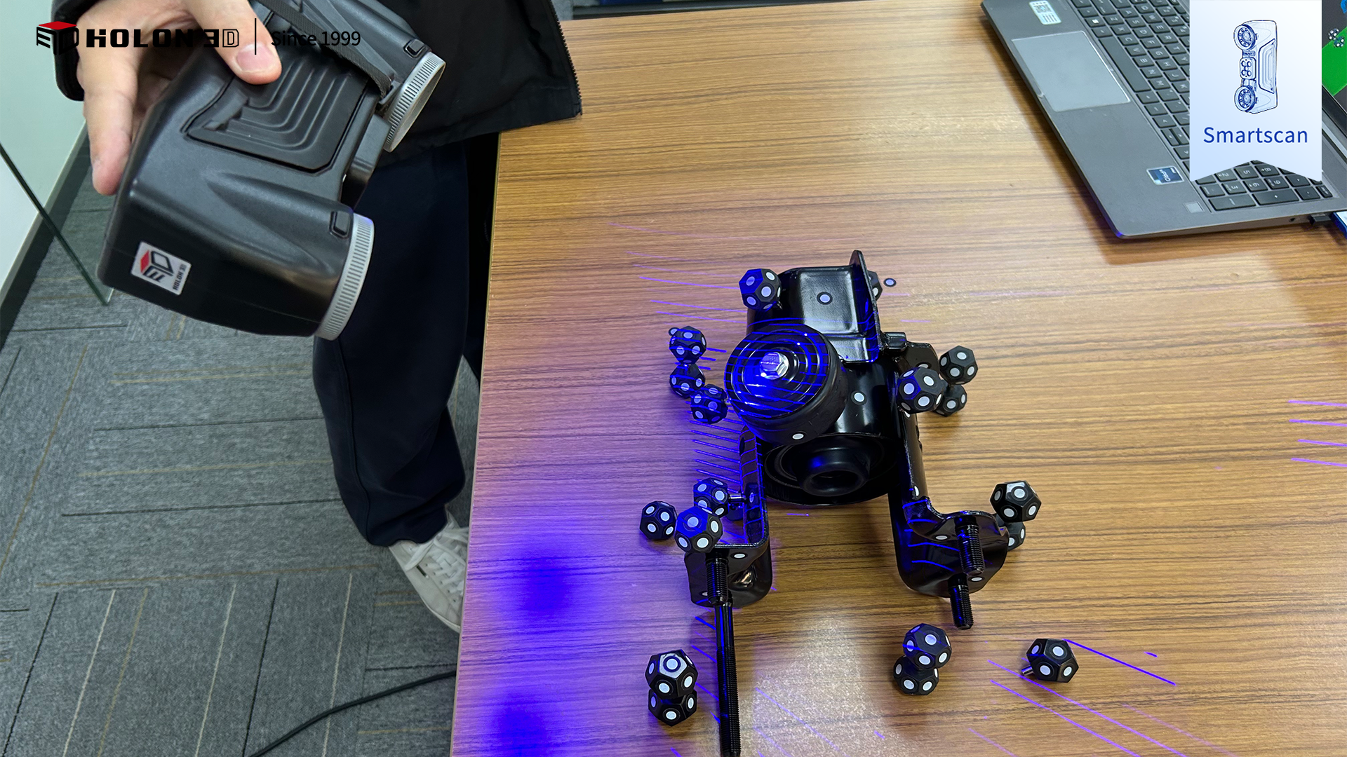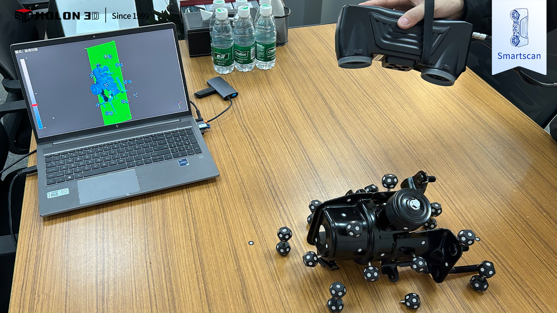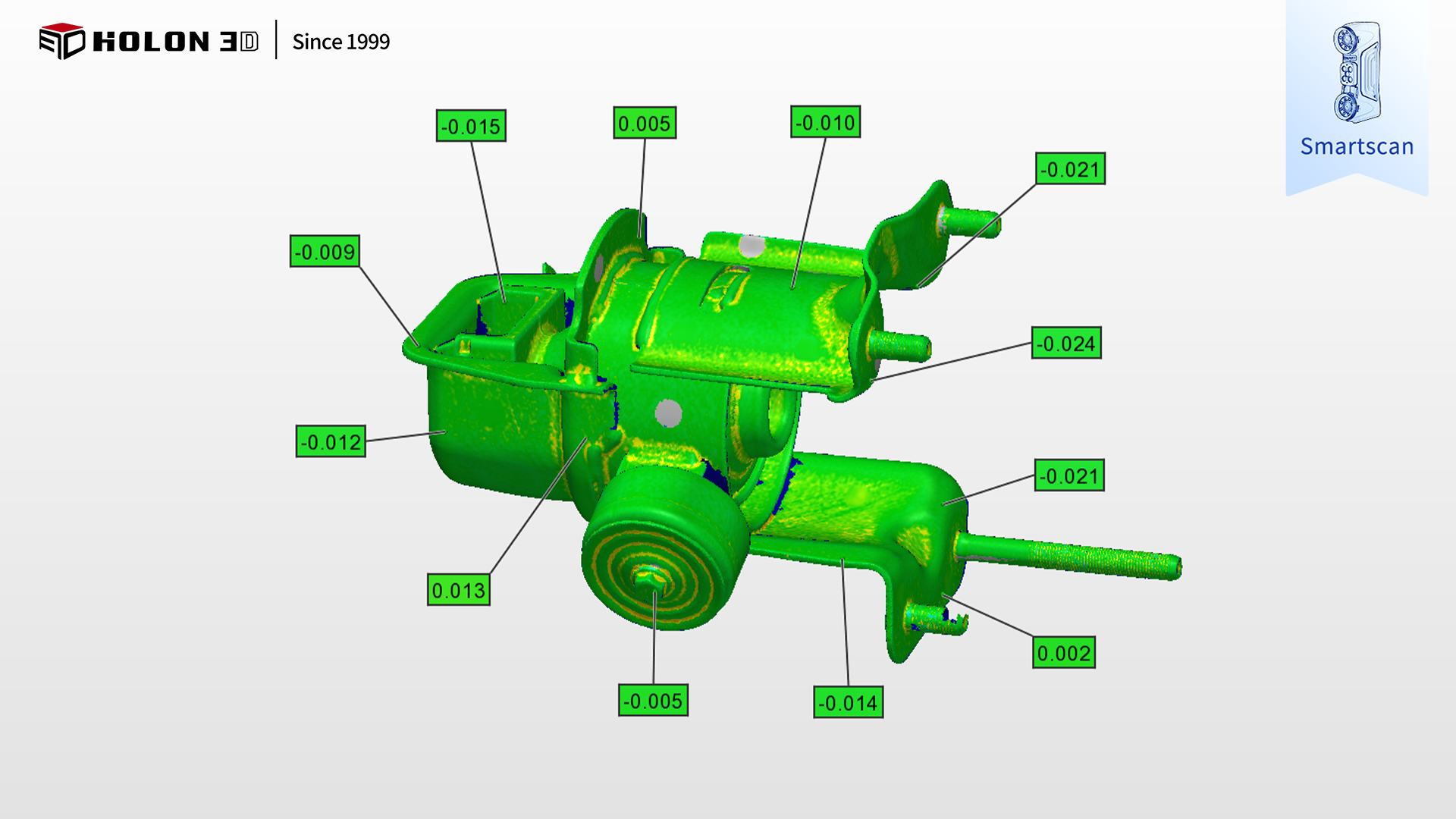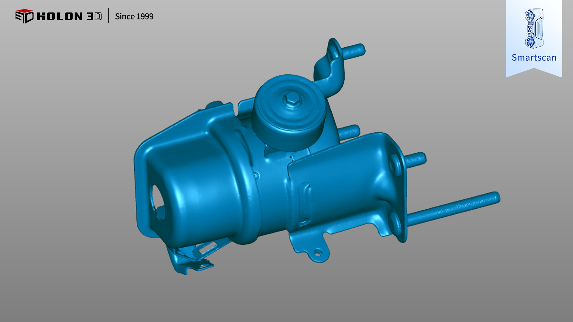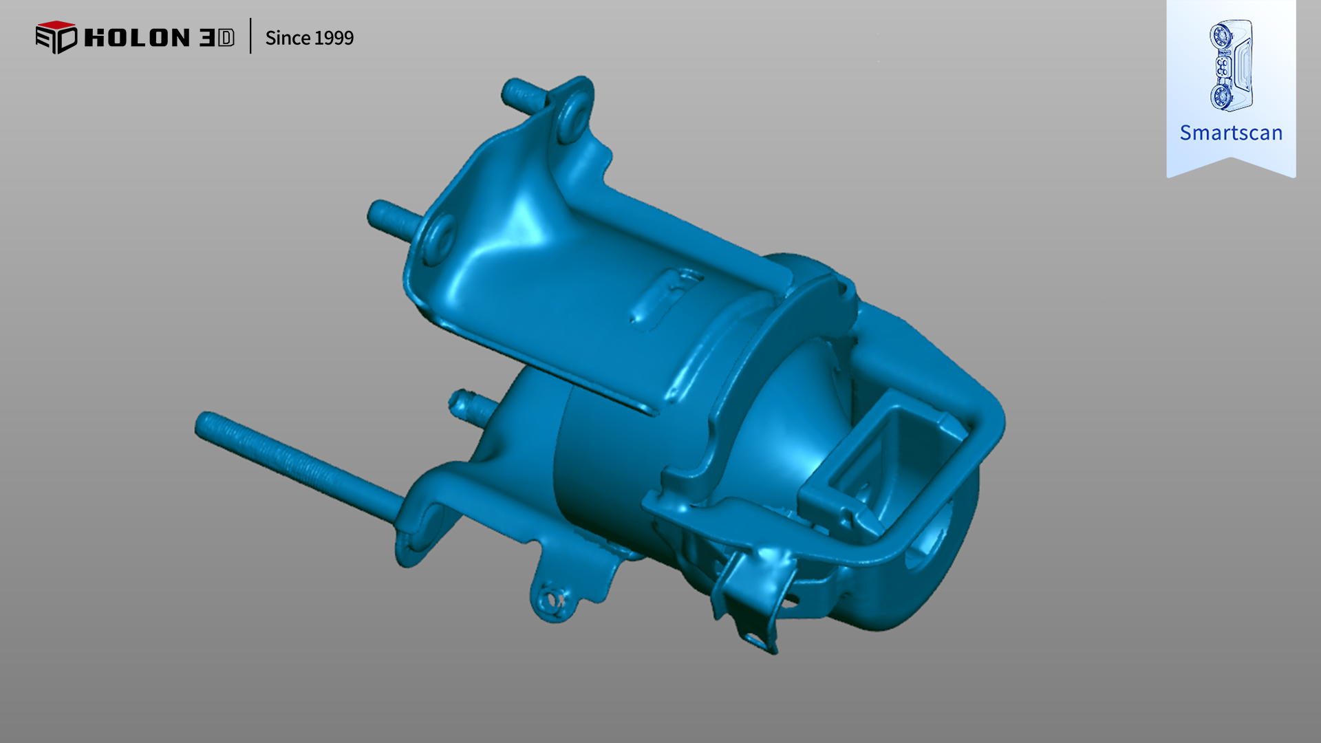 采用 HOLON3D Smart 49 扫描仪可针对性破解难题,其具备工业计量级精度,搭配全蓝激光技术,无需特殊预处理即可适配橡胶等复合材质,穿透表面油污干扰,精准捕捉磨损细节与整体结构数据;搭载四种扫描模式,可根据机脚胶整体轮廓、细微磨损区域灵活切换,配合手持设计自由调整扫描角度,轻松覆盖接触面、隐蔽缓冲结构等区域,实现全特征无死角扫描;高速无接触测量避免触碰导致柔软材质变形,保障数据真实性,且不受现场场景约束,仅需粘贴少量标志点即可稳定输出高质量数据;扫描数据与原始模型比对生成清晰色谱图,直观量化磨损误差分布,精准判断是否需要换新,完全契合客户严苛需求,为发动机机脚胶的维修检测提供可靠数字化支撑。