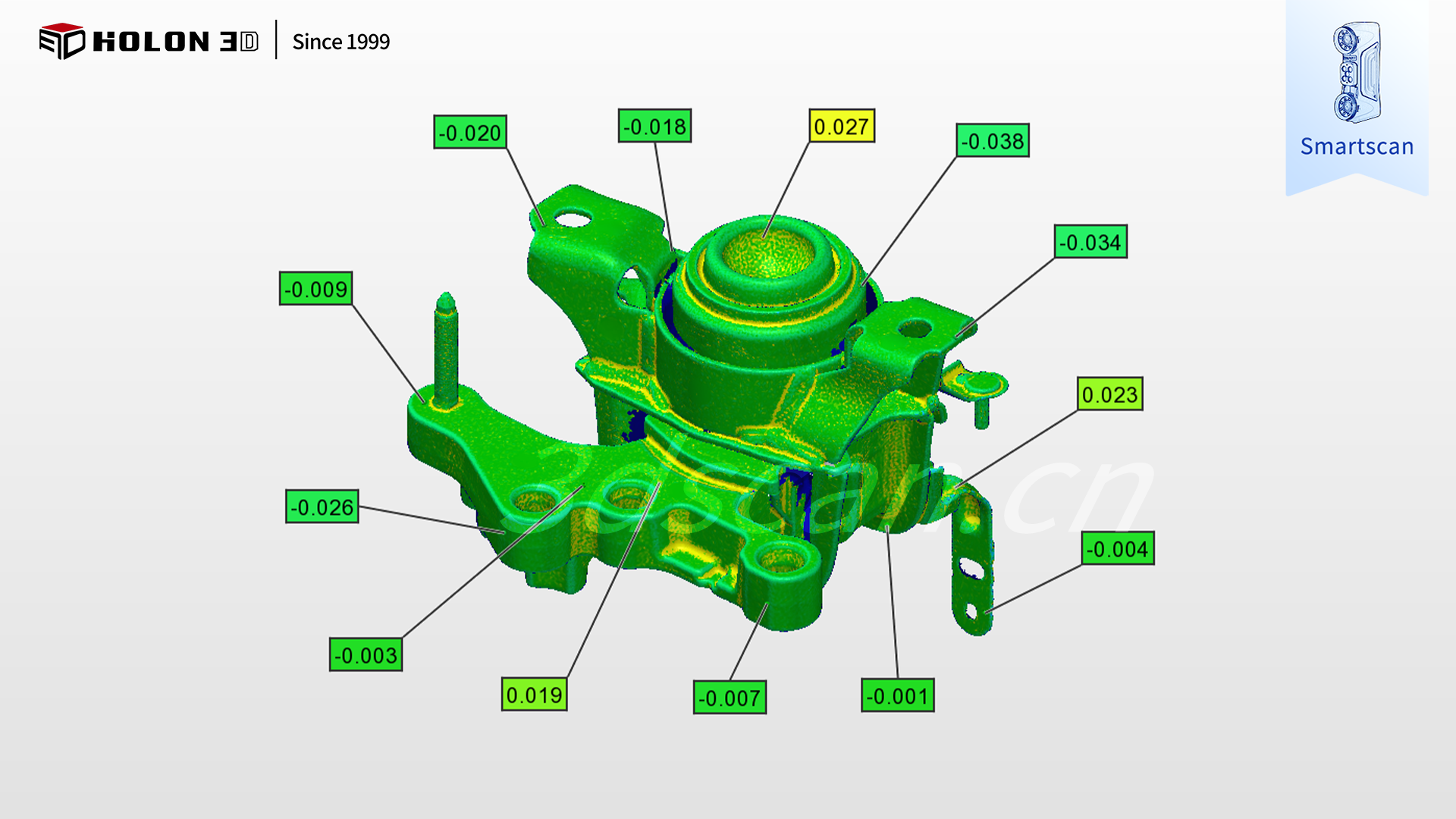 采用 HOLON3D Smart 49 扫描仪可针对性破解难题,其具备工业计量级精度,搭配全蓝激光技术,无需特殊预处理即可适配支架材质特性,精准捕捉安装孔、加强筋等关键特征数据;搭载四种扫描模式,可根据支架整体轮廓、细微特征及隐蔽区域灵活切换,配合手持设计自由调整扫描角度,实现全区域无死角扫描;高速无接触测量避免工件损伤,不受场景约束,仅需粘贴少量标志点即可稳定输出高质量数据;扫描数据与原始模型比对生成清晰色谱图,准确量化误差分布,科学判定合格性,完全契合客户需求,为发动机支架质量管控与工艺优化提供可靠支撑。