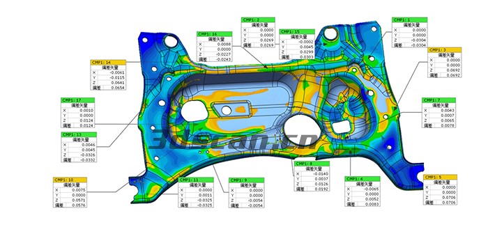冲压件主要是通过冲压模具冲压加工形成的,在生产的过程中可能会出现一些误差。客户想要对汽车钣金件做检测,需要借助先进的测量工具,通过精准的三维测量,经过高精度数据,来判断钣金件是否存在变形受损,并进行变形情况分析,以便做出修复方案。