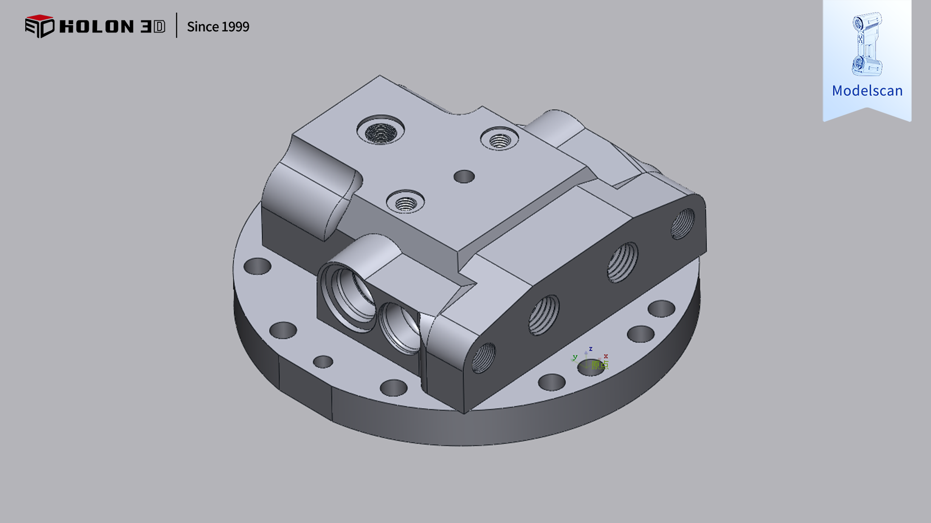 Holon3D采用Model 49全蓝光扫描仪,通过可调激光亮度穿透黑色表面反射干扰,智能抑制金属反光噪点。0.02mm超高精度配合420万点/秒扫描速度,结合深孔模式与精密模式,完整获取螺纹牙型、深孔底径等关键数据,快速完成全尺寸逆向建模,数据可直接用于逆向设计开发。