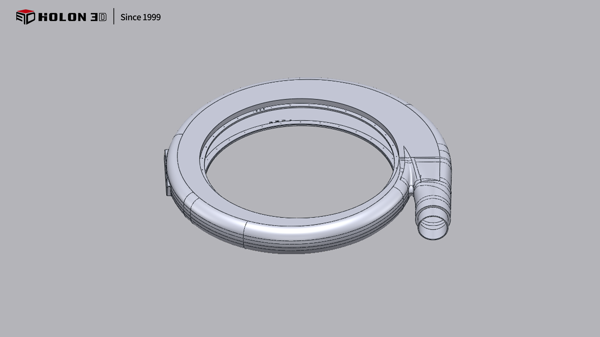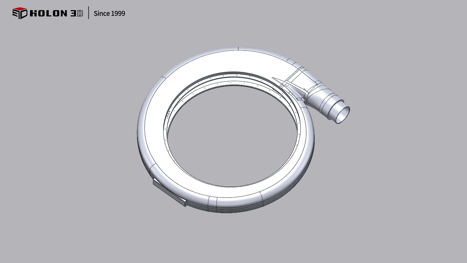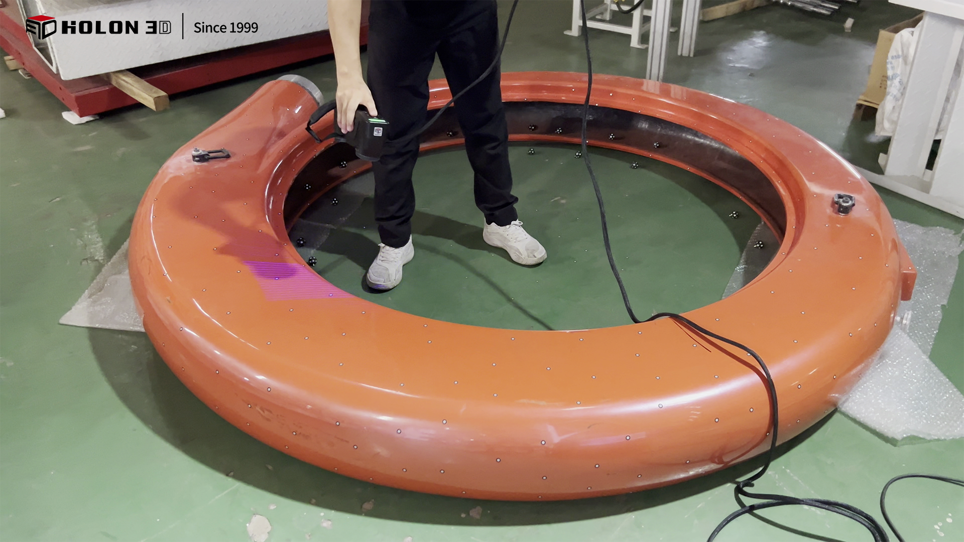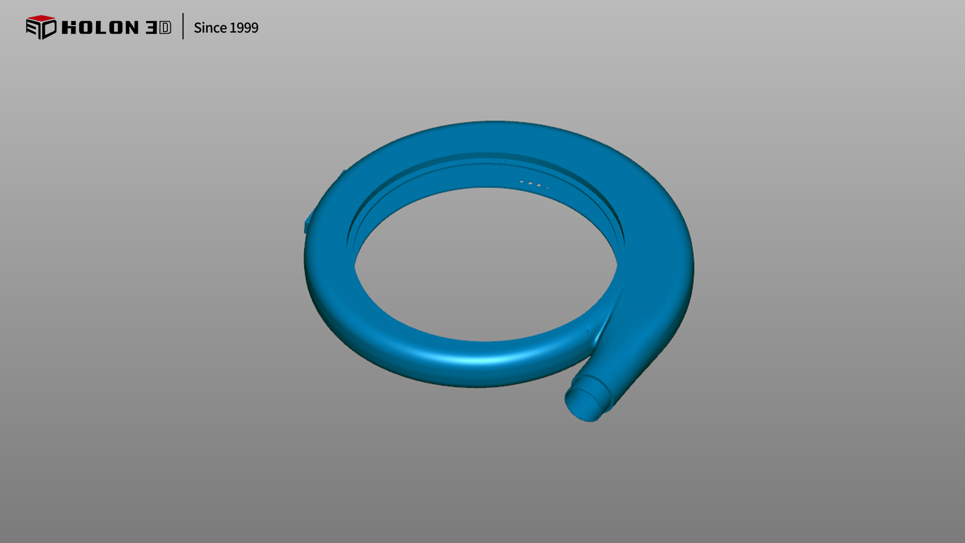 直径 2.2 米的蜗壳作为大型流体设备的核心部件,其螺旋曲面精度与整体结构完整性直接影响设备的流体动力性能与运行效率。客户需对该大型蜗壳进行三维扫描,获取精准、完整的三维数据,通过逆向建模生成 CAD 模型,为产品复刻、结构优化或备件生产提供可靠依据。由于蜗壳体积庞大、曲面结构复杂,且客户对扫描精度与工件数据完整性要求极高,传统测量方式难以满足需求,因此选择 HOLON 3D Smart 49 手持式全蓝激光工业级三维扫描仪,为大型蜗壳的数字化逆向建模提供高效、精准的技术支撑。