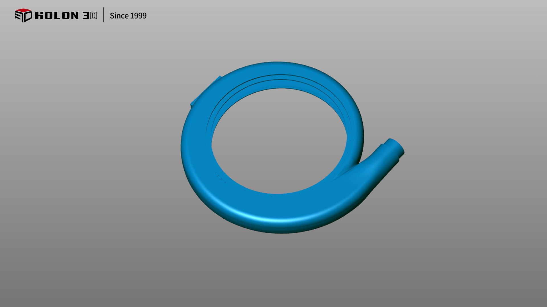 采用 HOLON 3D Smart 49 手持式全蓝激光工业级三维扫描仪,针对性破解大型蜗壳扫描的核心难题。该扫描仪搭载全蓝激光技术,抗反光能力优异,即使蜗壳表面存在反光,也能清晰捕捉螺旋曲面的弧度变化、流道内壁的细节特征,确保扫描精度完全匹配逆向建模的严苛要求;手持设计灵活便捷,不受大型工件体积与结构限制,可自由围绕蜗壳移动扫描,轻松覆盖 2.2 米直径的全表面及隐蔽流道区域,避免测量盲区,保障数据完整性;高速扫描能力大幅缩短大型工件的数据采集周期,配合无接触式测量方式,既避免了对蜗壳表面的损伤,又能快速还原工件真实结构,无需分段拼接即可获取整体三维数据,有效规避拼接误差;扫描仪适应性强,可在车间等复杂现场环境下稳定工作,无需复杂的前期准备。扫描后生成的三维数据完整、精准,可直接用于逆向建模生成 CAD 模型,完全符合客户需求,为大型蜗壳的产品复刻、结构优化及备件生产提供了高效且可靠的数字化保障。