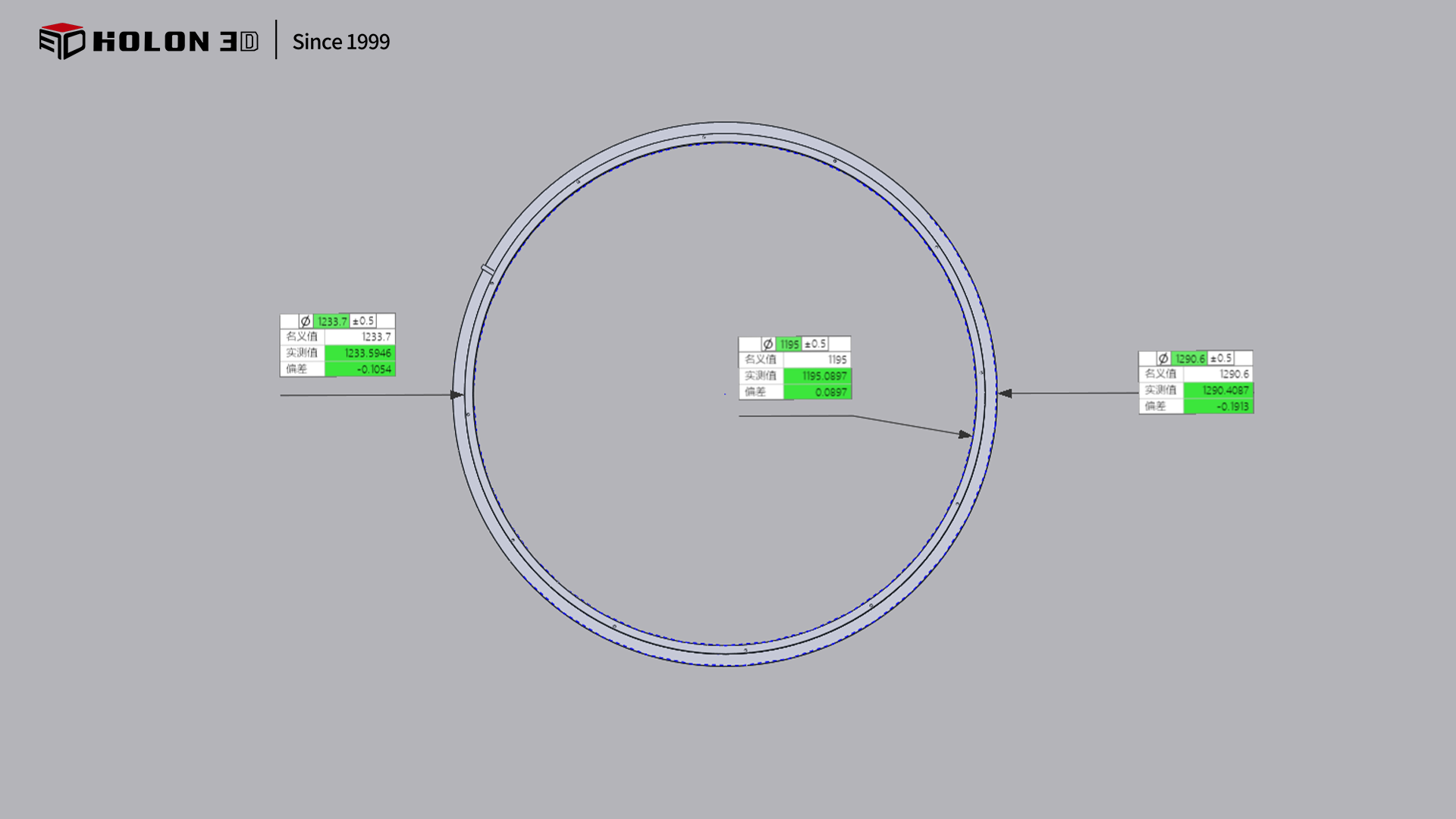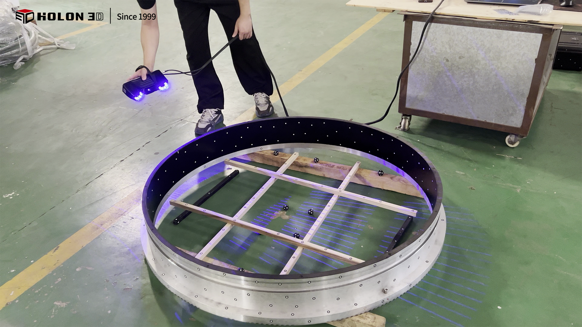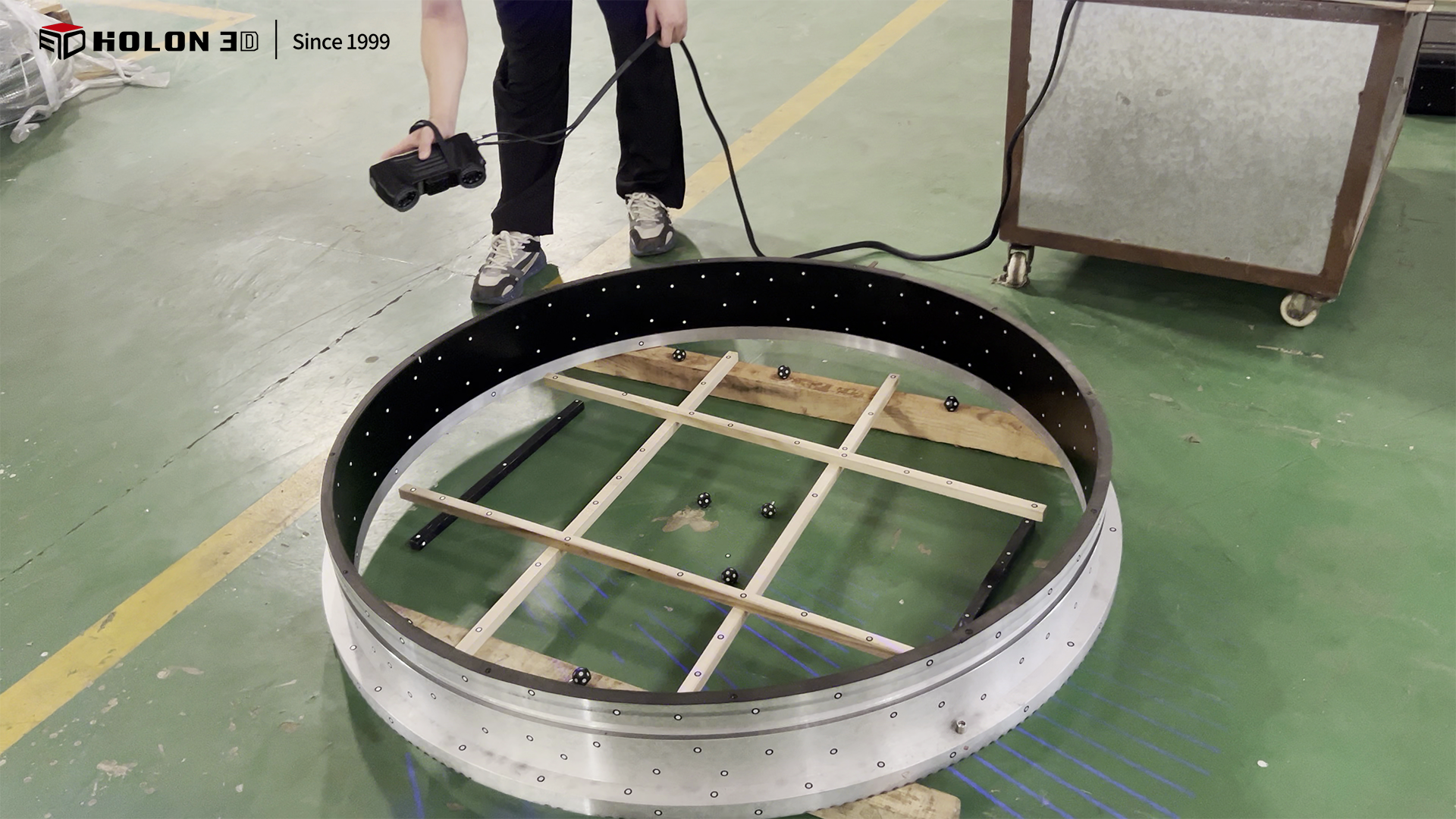 直径 1.3 米的圆形工件作为工业生产中常见的大型精密部件,其整体形态精度与尺寸公差直接影响后续装配适配性与设备运行稳定性。客户需对该圆形工件进行三维扫描,获取高精度、完整的三维数据,通过与原始模型比对生成三维检测色谱图,借助色谱图直观量化误差分布,以此判断工件是否合格。由于工件尺寸较大且客户对扫描精度、数据完整性要求极高,同时需适配客户现场的检测场景,传统测量方式难以满足需求,因此选择 HOLON 3D Smart 49 手持式全蓝激光工业级三维扫描仪,为圆形工件的精准质量检测提供可靠数字化支撑。