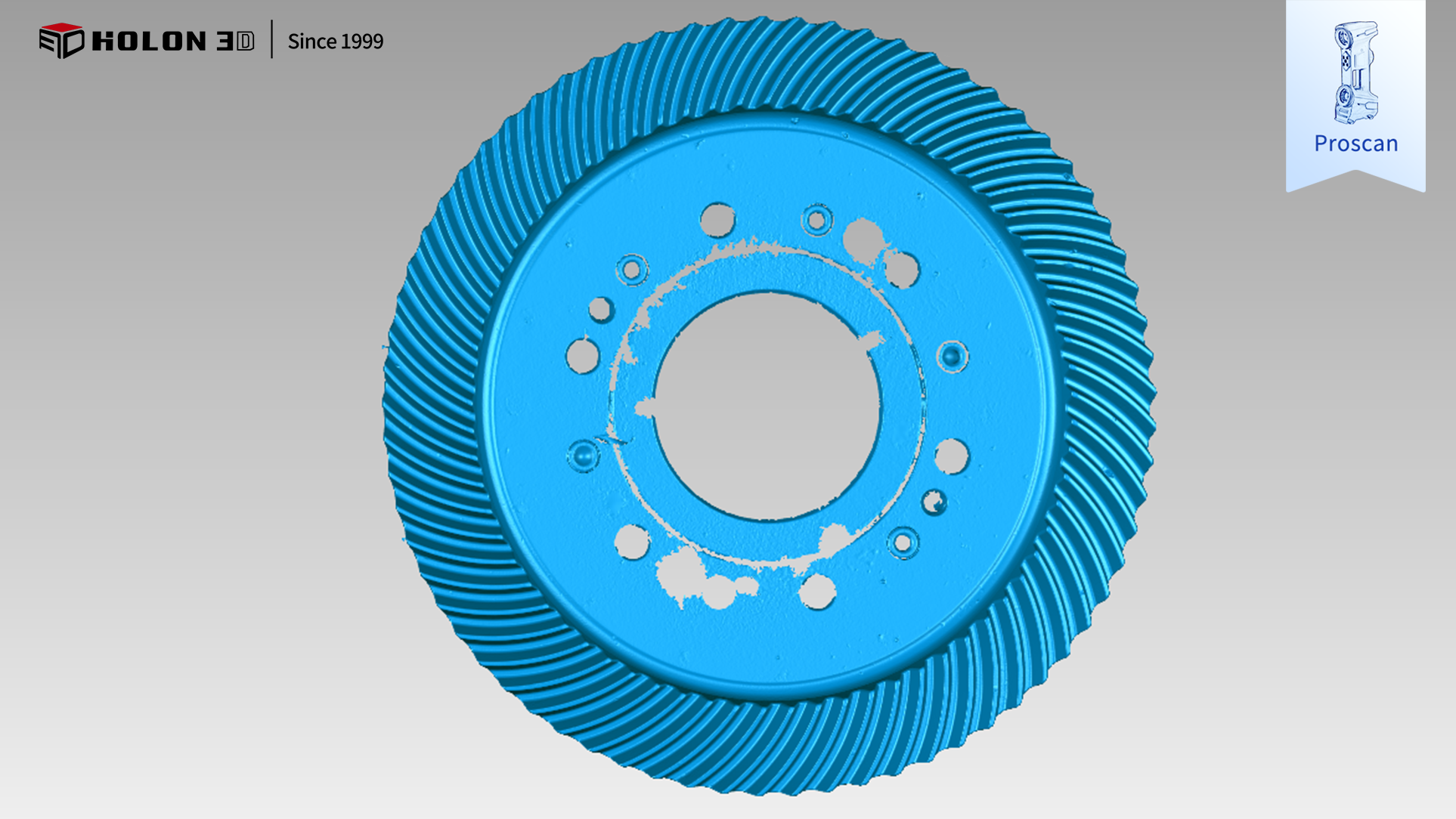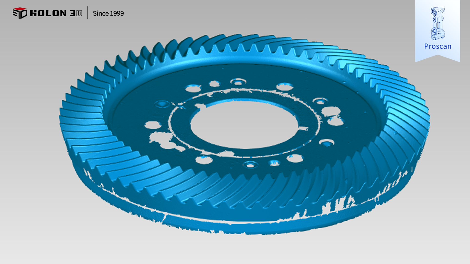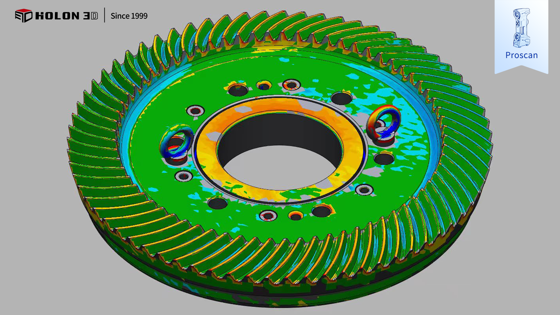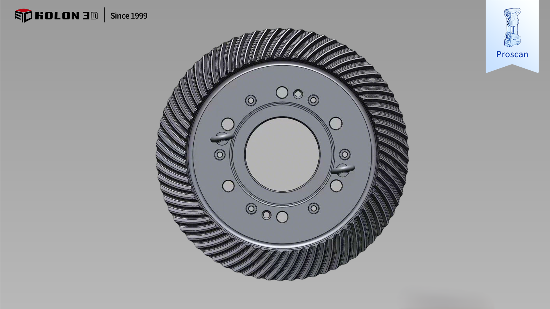 采用 HOLON 3D Proscan 手持式全蓝激光工业级三维扫描仪,可针对性破解减速机齿轮检测的核心难题。该扫描仪搭载全蓝激光技术,具备超高扫描精度,能精准捕捉齿面纹理、齿根圆角、内孔壁等细微结构与尺寸变化,获取全表面高精度三维数据,为生成精准三维检测色谱图奠定坚实基础,确保齿形、齿距等关键指标的误差量化无偏差;手持设计灵活便捷,可轻松调整角度覆盖齿轮的齿顶、齿根、内孔等所有关键部位,无测量盲区,保障数据完整性,让色谱图全面呈现整体误差分布;高速扫描能力大幅缩短数据采集时间,配合无接触式测量方式,既避免了对齿面精密加工层的刮伤,又能快速获取可靠数据,高效支撑合格性判定;扫描仪适应性强,不受场景约束,在车间等复杂环境下无需复杂前期准备,即可稳定输出高质量数据。扫描后生成的三维数据精准、完整,与原始模型比对可清晰生成三维检测色谱图,能准确量化误差以判断齿轮合格性,完全符合客户需求,为减速机齿轮的质量管控与生产工艺优化提供了可靠的数字化保障。